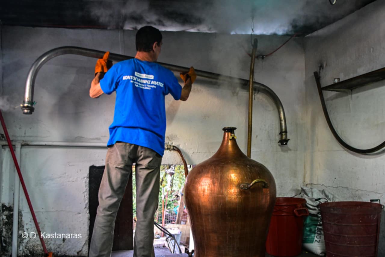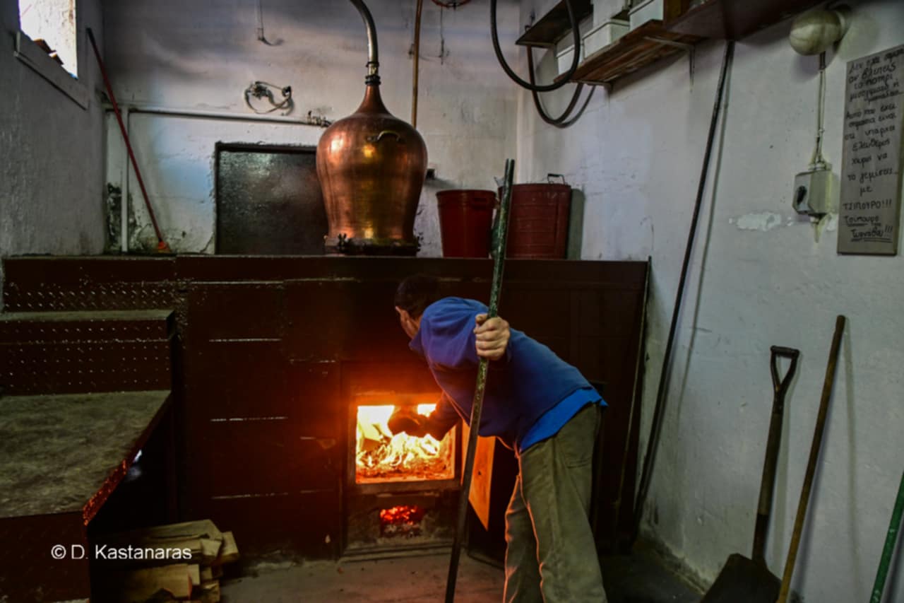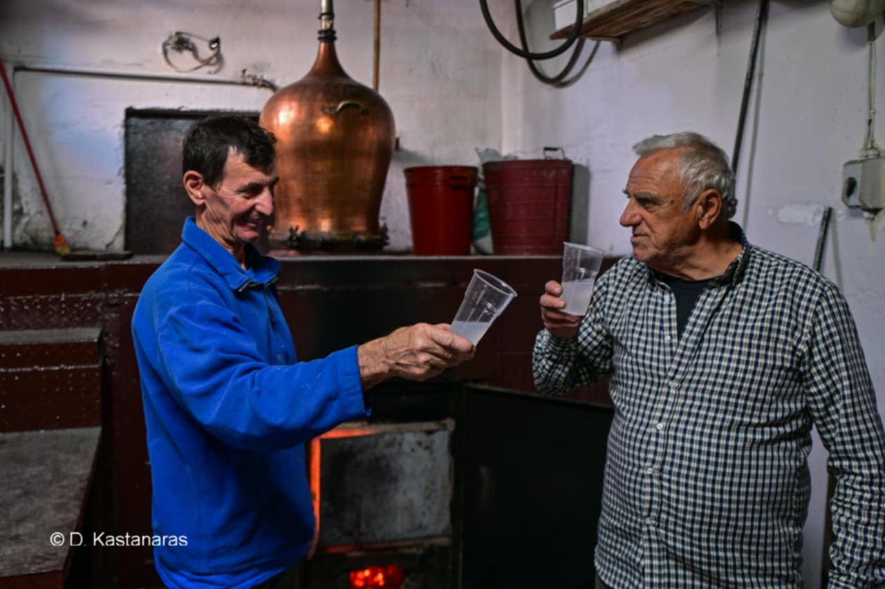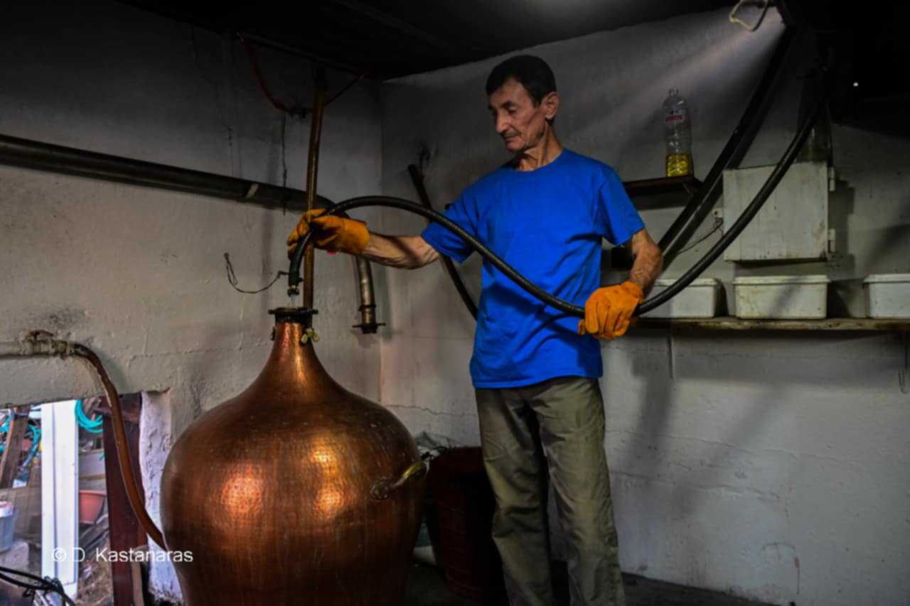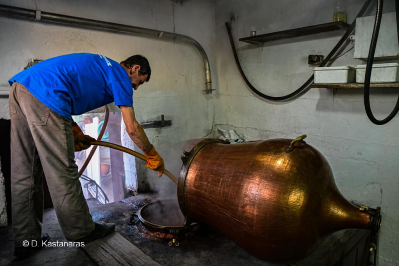 Κατά τη διάρκεια της επίσκεψής μας, παρουσιάστηκε αναλυτικά η διαδικασία της απόσταξης μέσα από εικόνες που αποτύπωναν κάθε στάδιο: από το γέμισμα του καζανιού με τα στέμφυλα, μέχρι τη συλλογή των πρώτων σταγόνων του αποστάγματος. Ένα θέαμα που, κάθε φορά, μοιάζει με ιεροτελεστία.