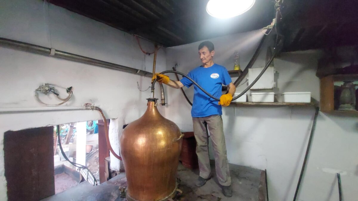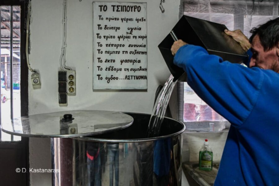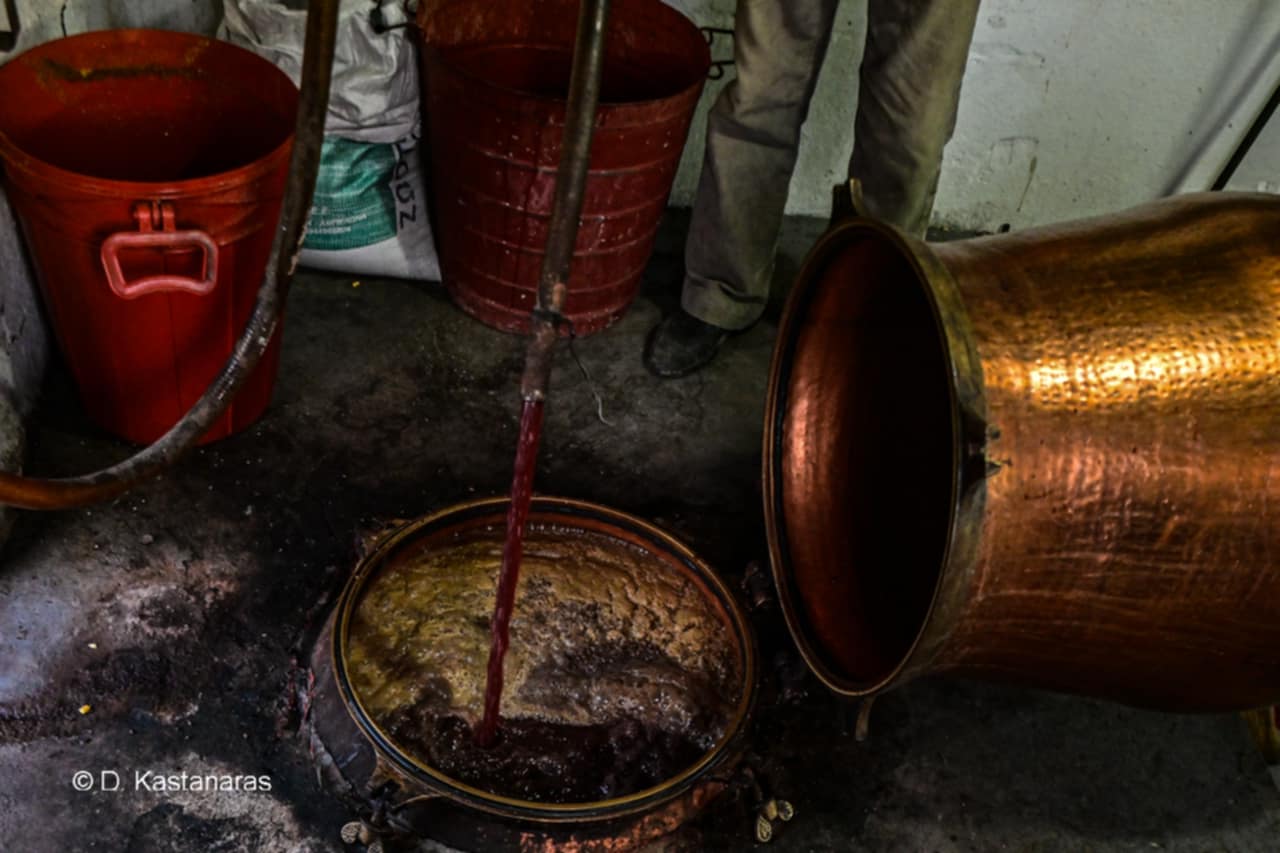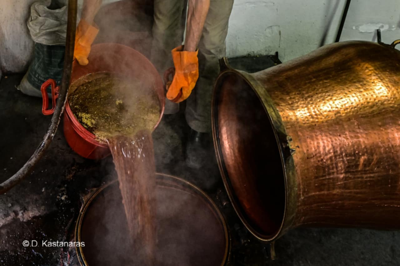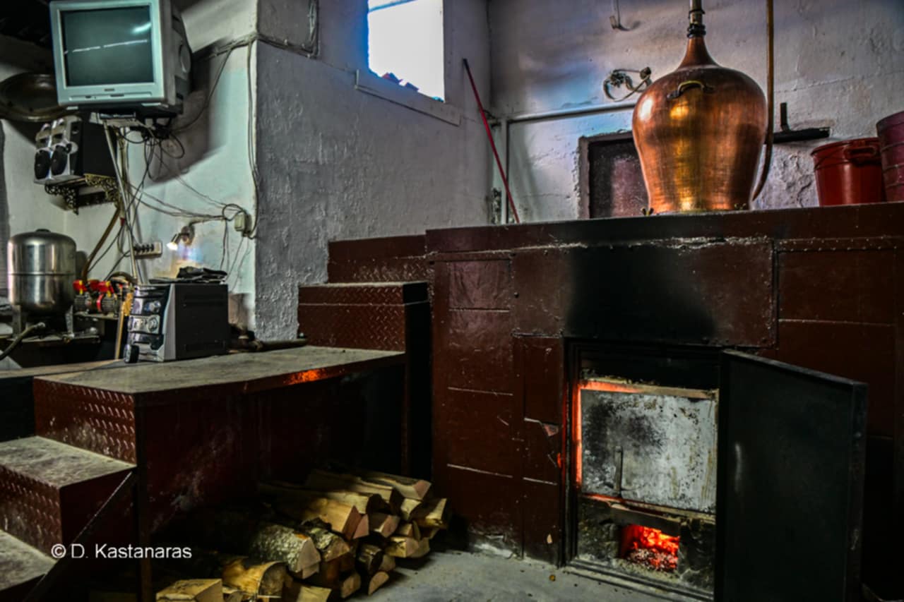 Κατά τη διάρκεια της επίσκεψής μας, παρουσιάστηκε αναλυτικά η διαδικασία της απόσταξης μέσα από εικόνες που αποτύπωναν κάθε στάδιο: από το γέμισμα του καζανιού με τα στέμφυλα, μέχρι τη συλλογή των πρώτων σταγόνων του αποστάγματος. Ένα θέαμα που, κάθε φορά, μοιάζει με ιεροτελεστία.