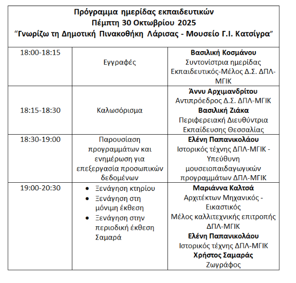 Η Δημοτική Πινακοθήκη Λάρισας – Μουσείο Γ.Ι. Κατσίγρα, στο πλαίσιο των δράσεων για το σχολικό έτος 2025–2026, και σε συνεργασία με την Περιφερειακή Διεύθυνση Πρωτοβάθμιας & Δευτεροβάθμιας Εκπαίδευσης Θεσσαλίας, ανακοινώνει τη διοργάνωση ημερίδας με τίτλο: «Γνωρίζω τη Δημοτική Πινακοθήκη Λάρισας – Μουσείο Γ.Ι. Κατσίγρα».