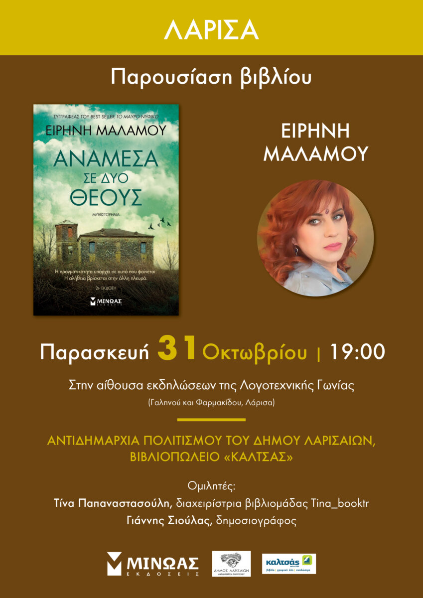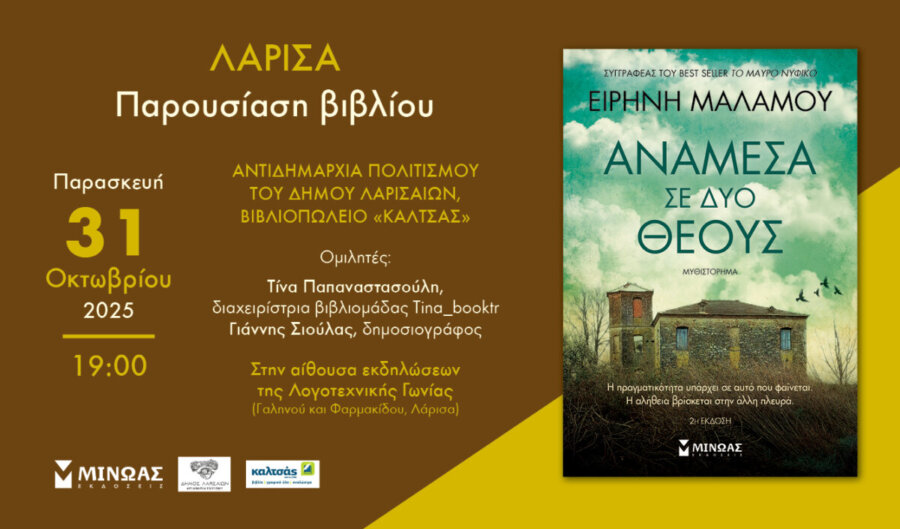 Το νέο βιβλίο της Ειρήνης Μαλάμου «Ανάμεσα σε δύο Θεούς» παρουσιάζεται την Παρασκευή 31 Οκτωβρίου 2025 στην Λογοτεχνική γωνία στις 19.00