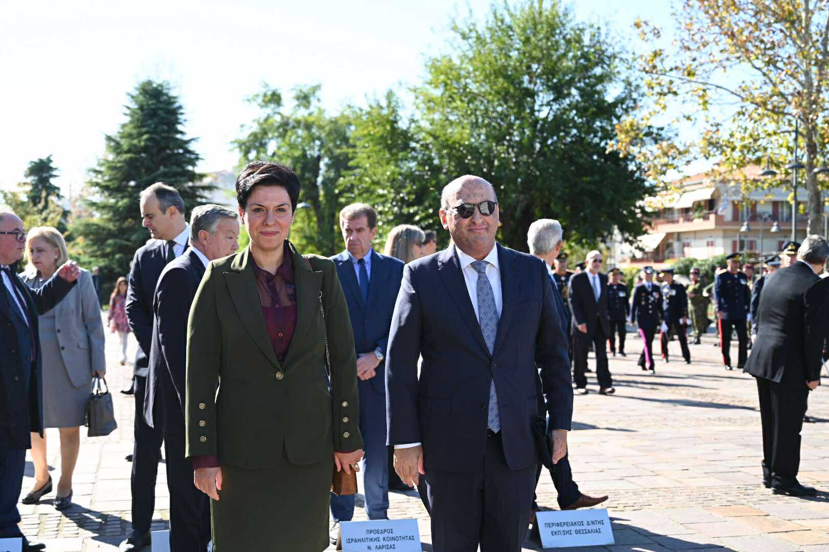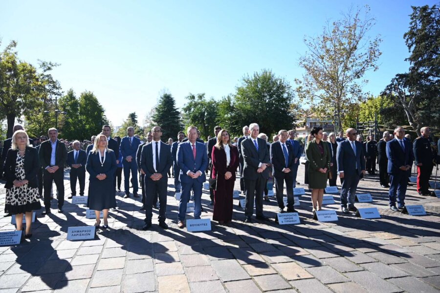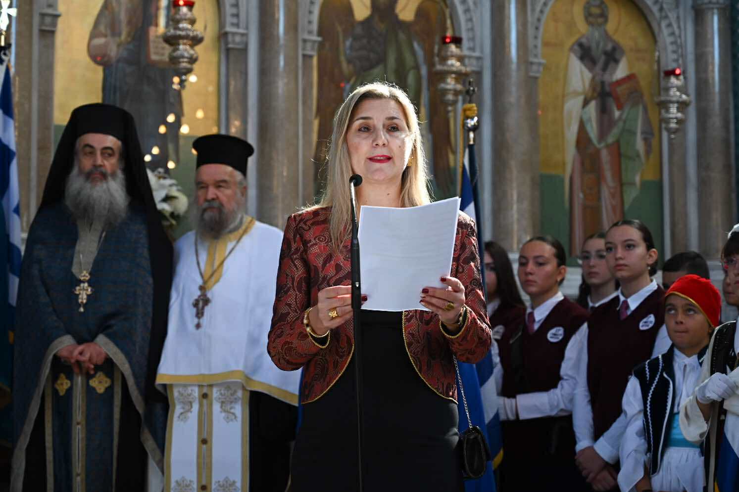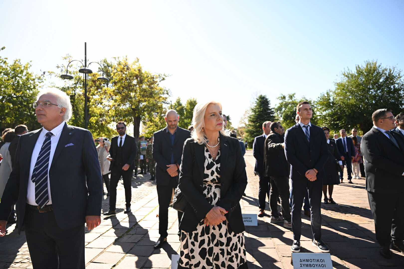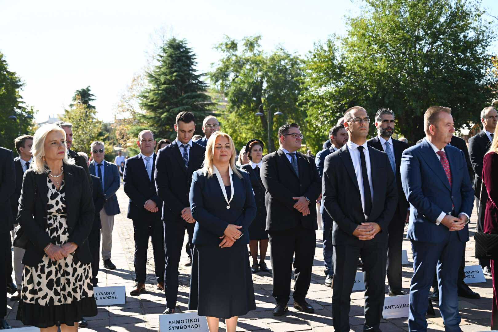 Μετά το τέλος της δοξολογίας εκφωνήθηκε ο πανηγυρικός της ημέρας από την Χρυσούλα Δαρδακούλη, Διευθύντρια του 19ου Δημοτικού Σχολείου Λάρισας, και έγινε ανάκρουση του Εθνικού Ύμνου.