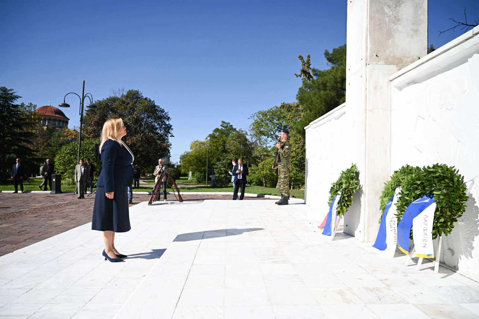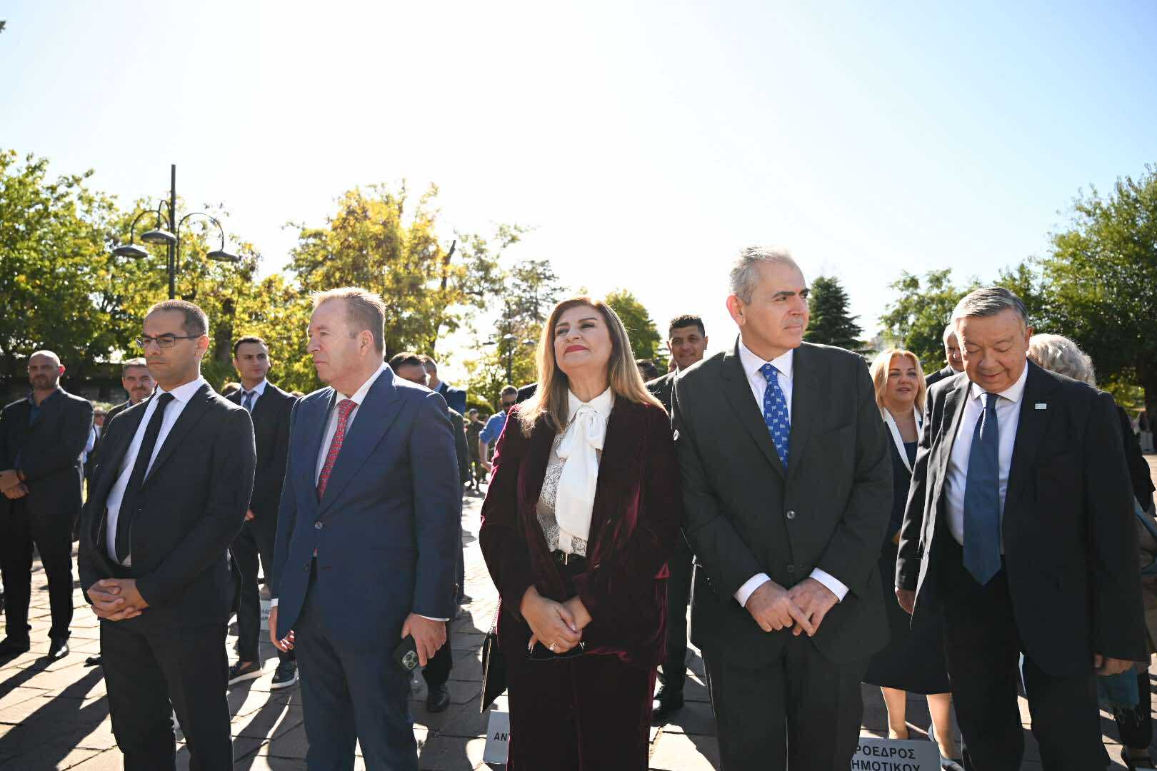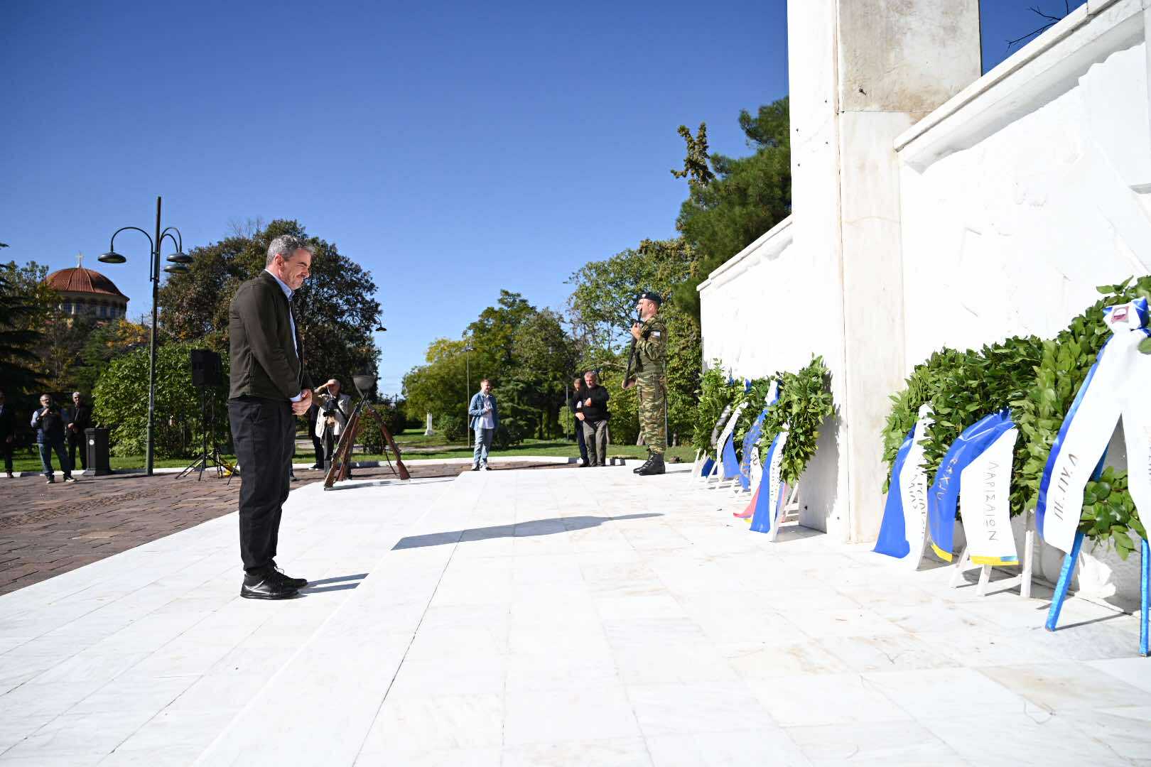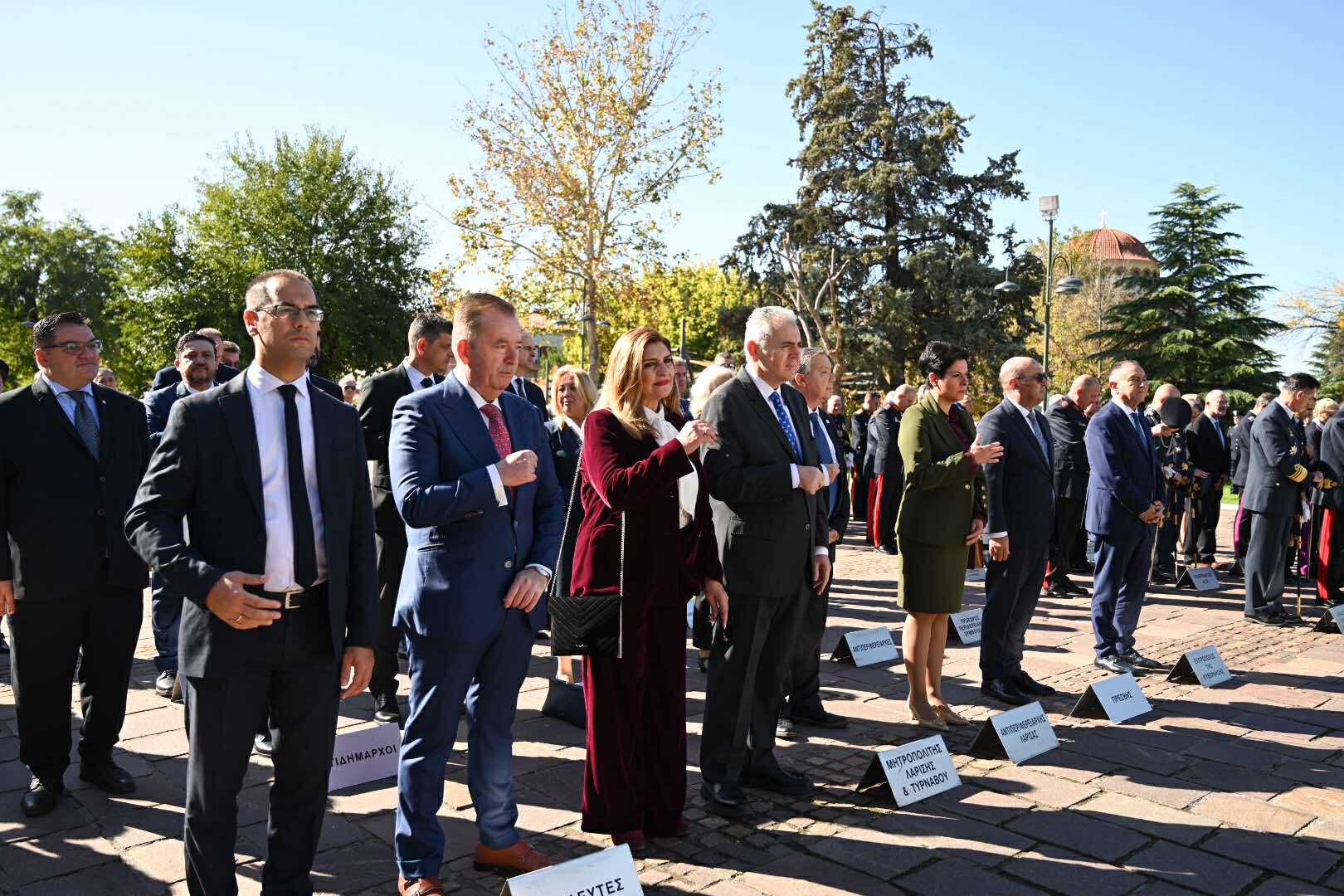 Μετά το τέλος της δοξολογίας εκφωνήθηκε ο πανηγυρικός της ημέρας από την Χρυσούλα Δαρδακούλη, Διευθύντρια του 19ου Δημοτικού Σχολείου Λάρισας, και έγινε ανάκρουση του Εθνικού Ύμνου.