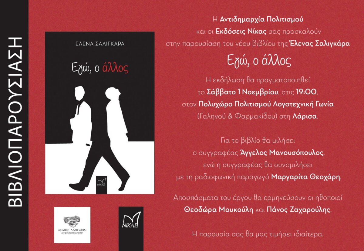Το βιβλίο παρουσιάζεται στη Λάρισα το Σάββατο 1η Νοεμβρίου στις 19:00, στον Πολυχώρο Πολιτισμού Λογοτεχνική Γωνία.