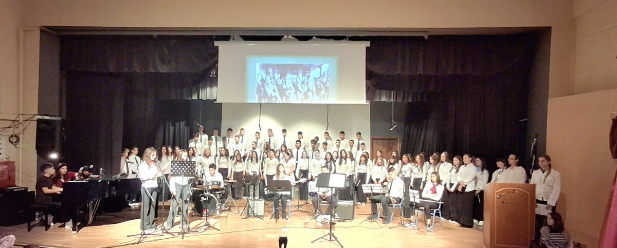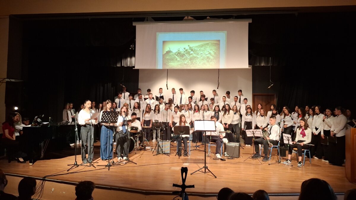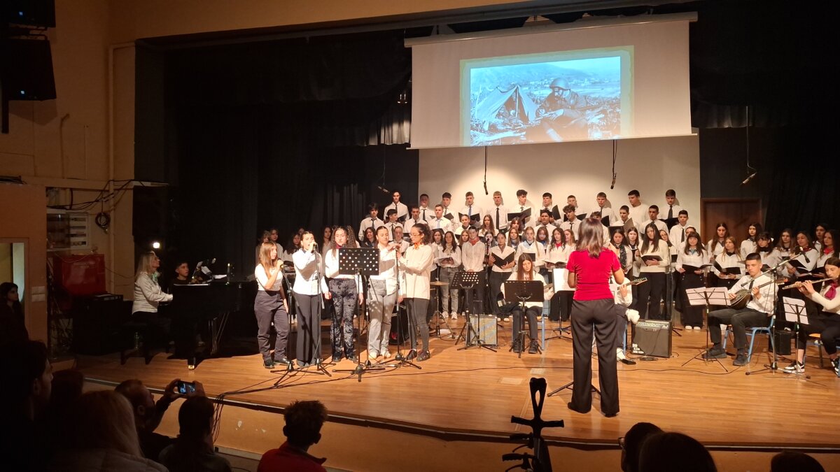 Ακολούθησε η εμφάνιση του συνόλου «Μιούζικαλ και Μουσικής Κινηματογράφου», που ερμήνευσε τραγούδια από το έργο «Άσμα ηρωικό και πένθιμο για τον χαμένο ανθυπολοχαγό της Αλβανίας», σε ποίηση Οδυσσέα Ελύτη και μουσική Νότη Μαυρουδή. Υπό τη διεύθυνση της κ. Κτιστάκη Ευφροσύνης (ΠΕ 79.01) και τη συνοδεία ορχήστρας μαθητών του συνόλου, οι μελωδίες πλημμύρισαν τον χώρο με πατριωτισμό και ευαισθησία. Στο πιάνο συνόδευσε η κ. Καραγιάννη Παρασκευή (ΠΕ79.01), ενώ την ενορχήστρωση και τη χορωδιακή επεξεργασία των τραγουδιών ανέλαβε ο κ. Καμπούρης Μανώλης (ΠΕ 79.01). Η εκδήλωση ολοκληρώθηκε με την απονομή βραβείων και αριστείων στους διακριθέντες μαθητές ως αναγνώριση των προσπαθειών και των επιδόσεών τους μέσα σε κλίμα συγκίνησης.