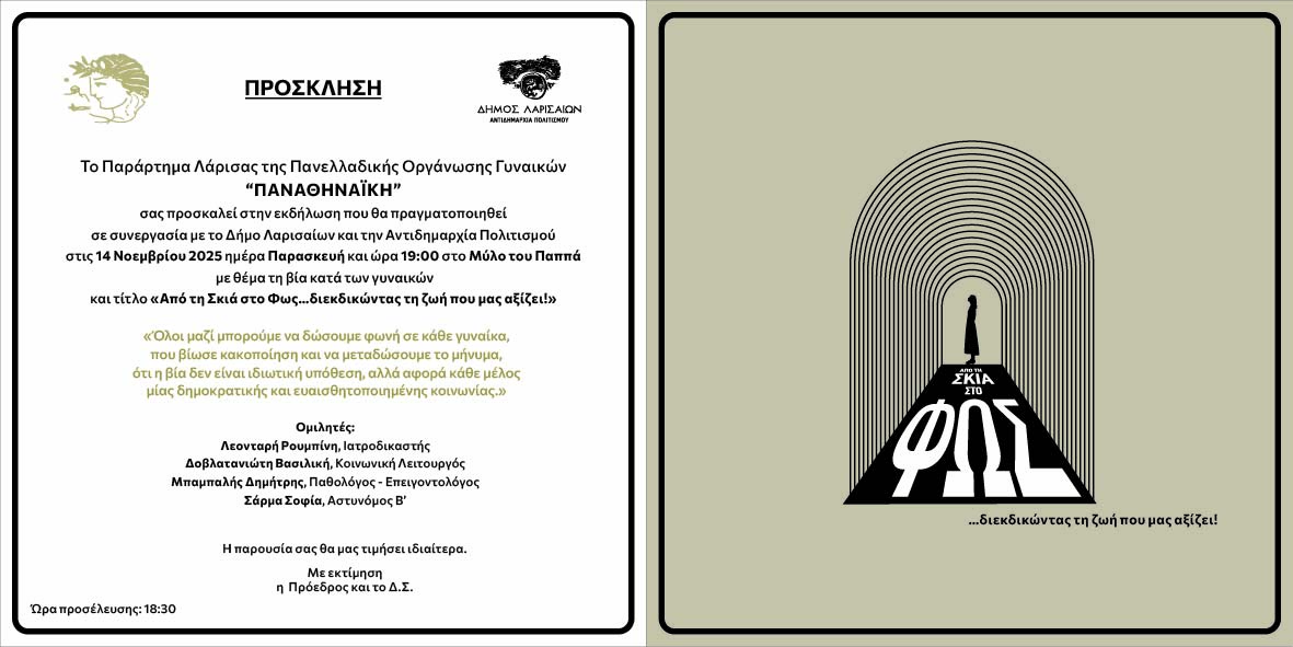 Εκδήλωση με θέμα τη βία κατά των γυναικών, διοργανώνει το Παράρτημα Λάρισας της] Πανελλαδικής Οργάνωσης Γυναικών «ΠΑΝΑΘΗΝΑΪΚΗ», την Παρασκευή 14 Νοεμβρίου 2025 και ώρα 19:00 στον Μύλο του Παππά, παρουσία της κ. Φάνης Πάλλη – Πετραλιά, πρώην υπουργού και ιδρυτικού μέλους της οργάνωσης «ΠΑΝΑΘΗΝΑΪΚΗ» και πρώτης προέδρου της οργάνωσης και της κ. Μαρίας Γιαννίρη, νυν και επί σειρά ετών προέδρου της Πανελλαδικής Οργάνωσης Γυναικών «ΠΑΝΑΘΗΝΑΪΚΗ».