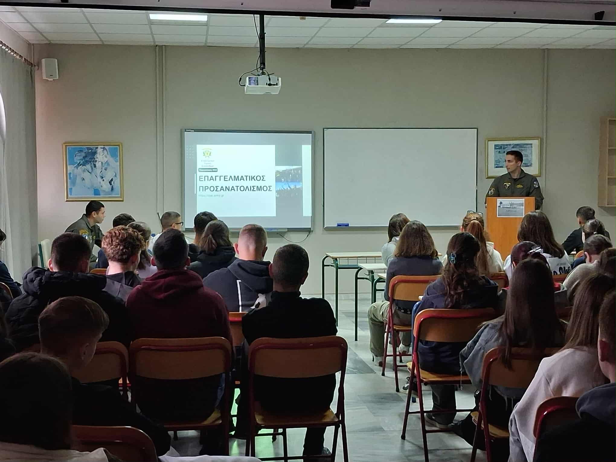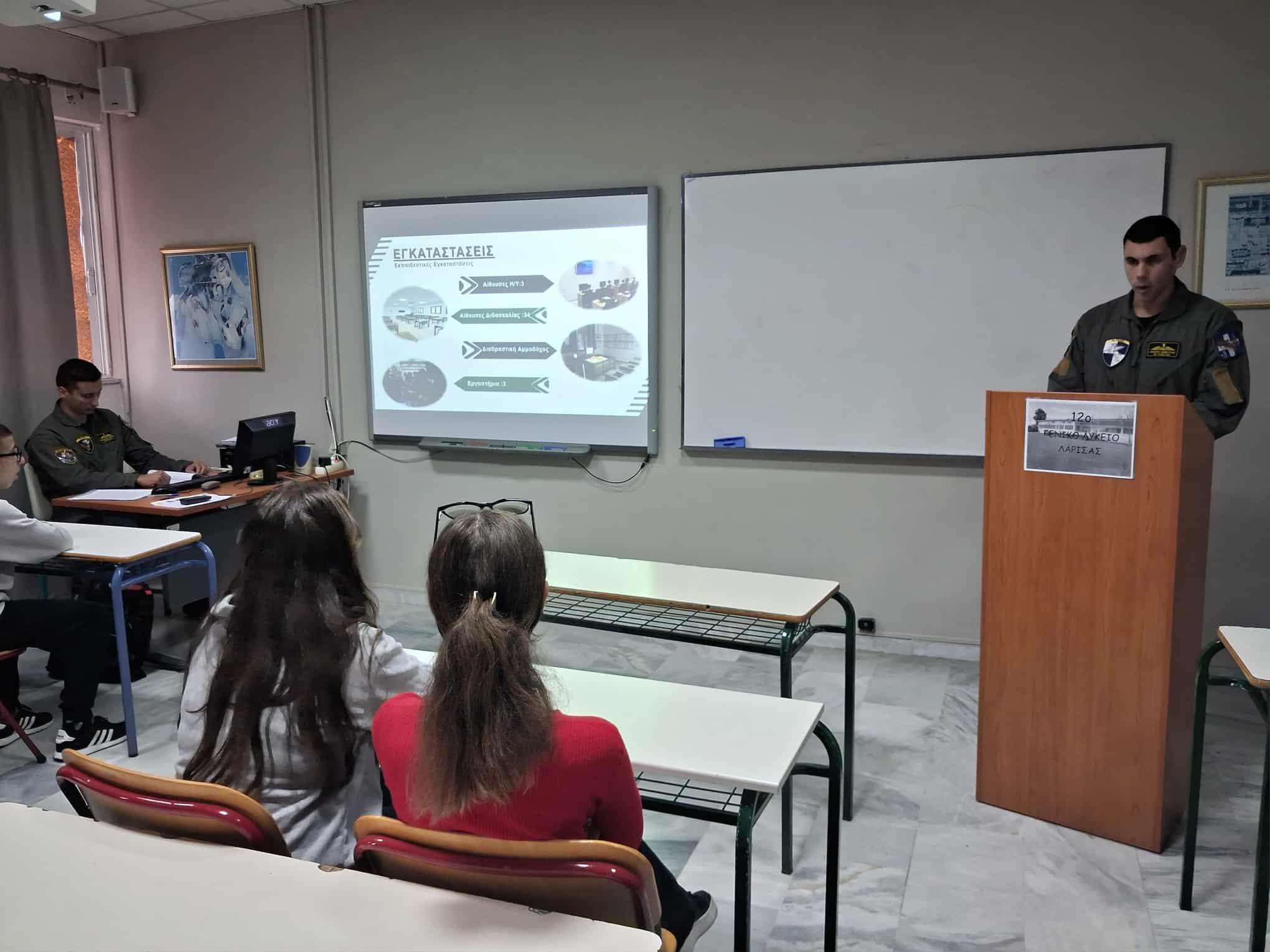Την Τετάρτη 5 Νοεμβρίου η Β΄ τάξη του 12ο ΓΕΛ Λάρισας στο πλαίσιο του επαγγελματικού προσανατολισμού, ενημερώθηκε από εκπροσώπους της 1ης Στρατιάς και της 1ης ΤΑΞΑΣ για τις προοπτικές που δημιουργούνται με την είσοδό τους στις Στρατιωτικές Σχολές Τριτοβάθμιας Εκπαίδευσης (Στρατιωτική Σχολή Ευελπίδων, Σχολή Μονίμων Υπαξιωματικών) και τη σταδιοδρομία τους ως Στελέχη του Στρατού Ξηράς.