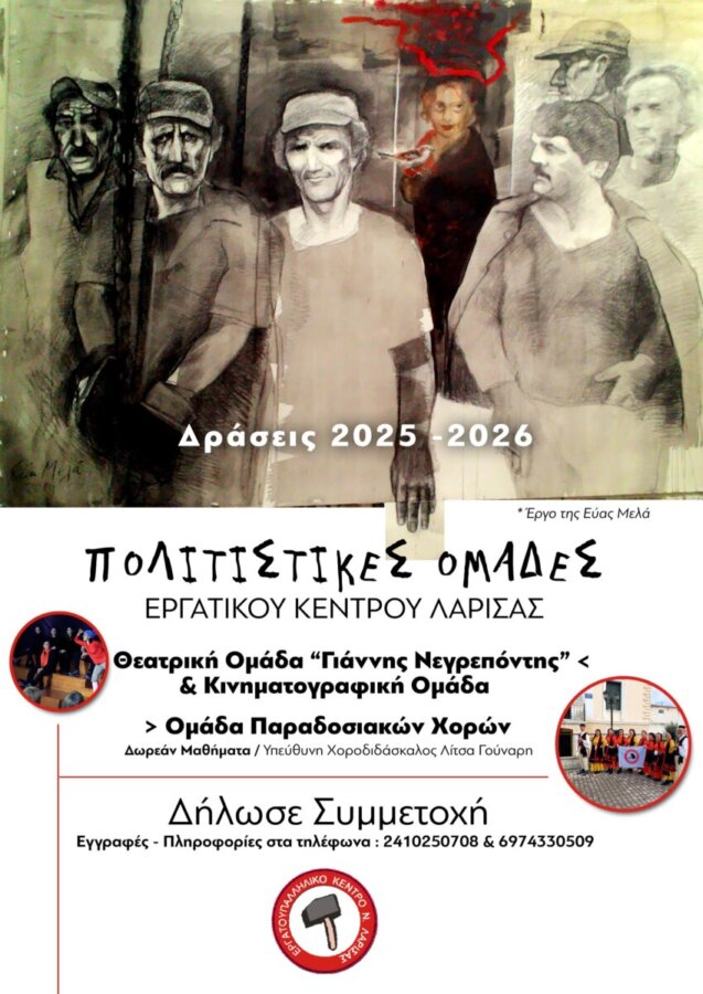 Πρόσκληση συμμετοχής στις Πολιτιστικές Ομάδες, απευθύνει το Εργατικό Κέντρο Λάρισας.
