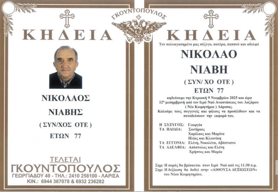 Η κηδεία του θα τελεστεί αύριο Κυριακή 9 Νοεμβρίου 2025 και ώρα 12η μεσημβρινή από τον Ιερό Ναό Αναστάσεως του Λαζάρου στο Νέο Κοιμητήριο Λάρισας.