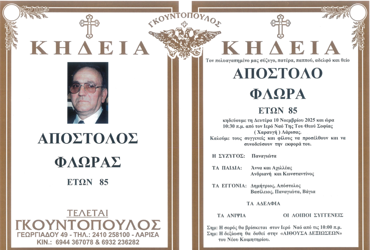 Έφυγε από τη ζωή σε ηλικία 85 ετών ο Απόστολος Φλωρας.