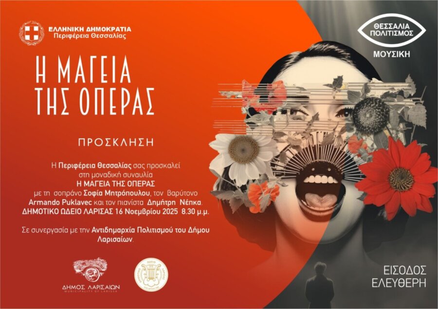 Η Περιφέρεια Θεσσαλίας διοργανώνει μια μοναδική μουσική βραδιά με διάσημα τραγούδια από δημοφιλείς όπερες και μιούζικαλ στις 16 Νοεμβρίου στις 8.30 το βράδυ στο Δημοτικό Ωδείο Λάρισας, σε συνεργασία με την Αντιδημαρχία Πολιτισμού του Δήμου Λαρισαίων.