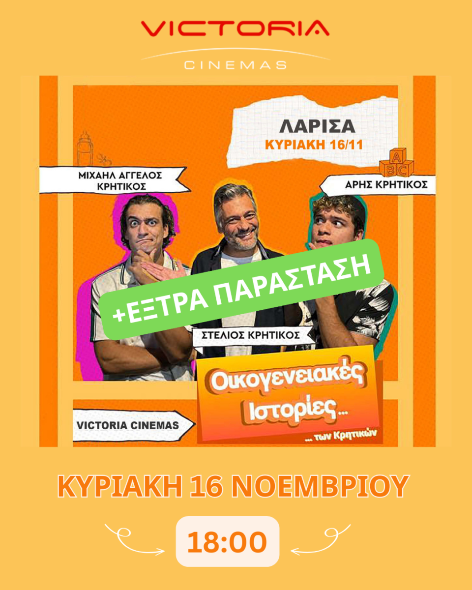 Μετά από τα απανωτά sold out σε Αθήνα και σε κάθε πόλη της Ελλάδας που έχουν ταξιδέψει, οι «ΟΙΚΟΓΕΝΕΙΑΚΕΣ ΙΣΤΟΡΙΕΣ ΤΩΝ ΚΡΗΤΙΚΩΝ» έρχονται στη Λάρισα και όπως ήταν αναμενόμενο – η παράσταση της Κυριακής 16 Νοεμβρίου στις 20:30 στο Victoria Cinemas εξαντλήθηκε!
