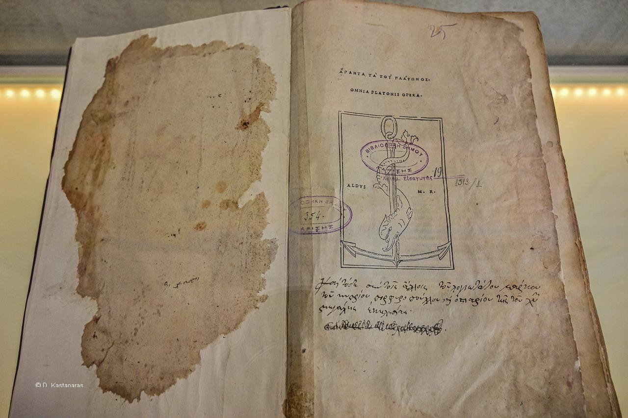 «Η γνώση που αποκτάται με καταναγκασμό δε συγκρατείται από τη μνήμη», επέμενε ο Έλληνας φιλόσοφος, Πλάτωνας, με τη ρήση να ανασύρεται θαρρείς σε προκαθορισμένο… ραντεβού σαν περάσαμε την πόρτα της Δημόσιας Κεντρικής Βιβλιοθήκης και τον Πλάτωνα να δίνει δυναμικό «παρών» από τις πρώτες κιόλα κουβέντες που ανταλλάξαμε με τη διευθύντριά της, Γεωργία Τσιάνα, καθώς το καμάρι της βιβλιοθήκης δεν είναι άλλο από την πρώτη τυπογραφική έκδοση όλων των έργων του Πλάτωνα – που έγινε το 1513 στον τυπογραφικό οίκο του Άλδου Μανούτιου, στη Βενετία – με τα Άπαντα του Πλάτωνα να βρίσκονται σε περίοπτη θέση στις προθήκες της.