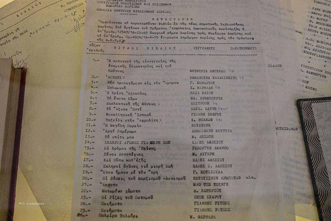 Το βλέμμα μας δεν αργεί να κεντρίσει ένας ιδιαίτερος κατάλογος, αυτός που την περίοδο της χούντας στάλθηκε σε όλες τις βιβλιοθήκες της χώρας, σε μια λίστα «απαγορευμένων» βιβλίων, που οι άνθρωποι της βιβλιοθήκης έκρυψαν και διέσωσαν μέχρι τις μέρες μας.