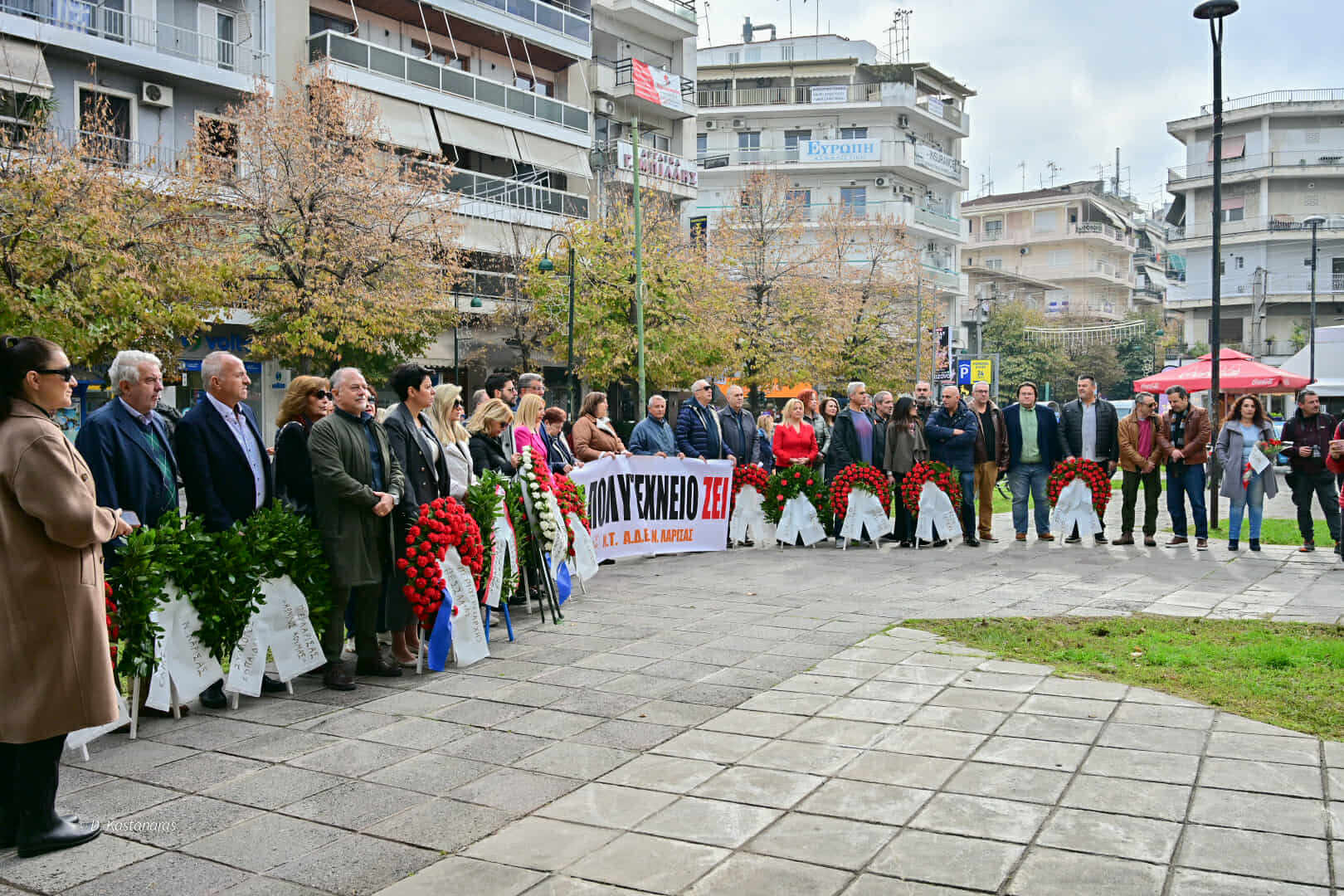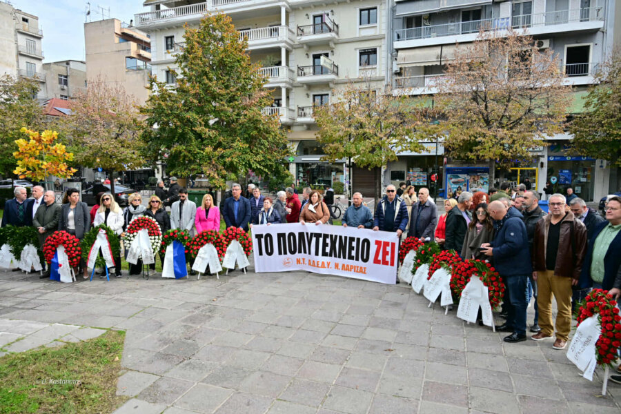 Την εξέγερση του Πολυτεχνείου τίμησαν σήμερα το πρωί στη Λάρισα στην πλατεία Ρήγα Φεραίου φορείς και σωματεία, ανταποκρινόμενα στο κάλεσμα της Ε.Γ. του Ν.Τ. ΑΔΕΔΥ Λάρισας.