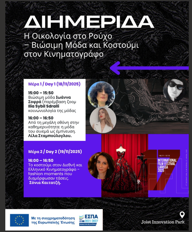 Στο πλαίσιο του 17ου Διεθνούς Φεστιβάλ Κινηματογράφου Λάρισας (IFFL) θα πραγματοποιηθεί στις 18 και 19 Νοεμβρίου στο Πάρκο Καινοτομίας JOIST Διημερίδα με θέμα: Η Οικολογία στο Ρούχο – Βιώσιμη Μόδα και Κοστούμι στον Κινηματογράφο.