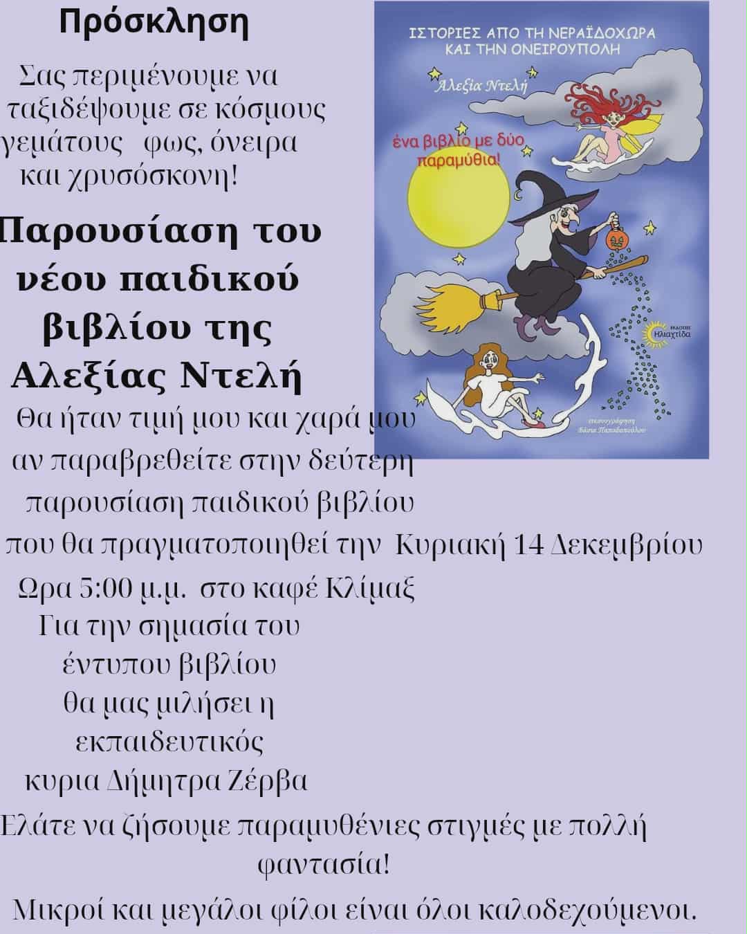 Η βιβλιοπαρουσίαση θα πραγματοποιηθεί την Κυριακή 14 Δεκεμβρίου, στις 5 το απόγευμα, στο καφέ Κλίμαξ (απέναντι από το αρχαίο θέατρο), ενώ για τη σημασία του έντυπου βιβλίου στην παιδική ηλικία θα μιλήσει η εκπαιδευτικός, Δήμητρα Ζέρβα.