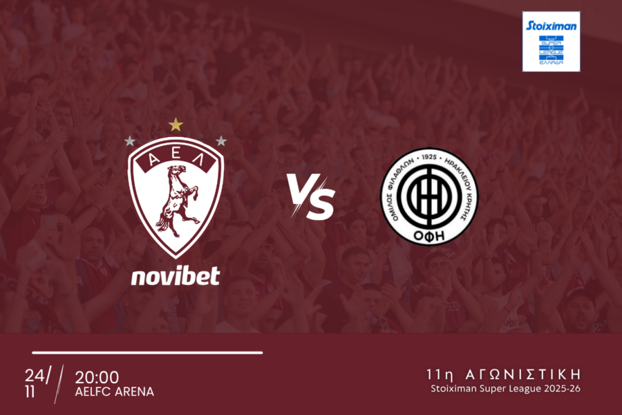 Η ΠΑΕ ΑΕΛ Novibet ενημερώνει τους φιλάθλους της ότι ξεκίνησε η διάθεση των εισιτηρίων του αγώνα της 11ης Αγωνιστικής του πρωταθλήματος Stoiximan Super League με αντίπαλο τον ΟΦΗ στο AEL FC ARENA(24/11, 20:00).