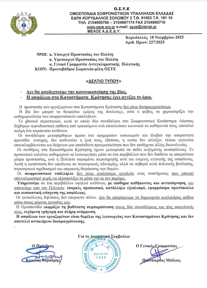 Το χθεσινό περιστατικό, κατά το οποίο δύο συνάδελφοι στο Σωφρονιστικό Κατάστημα Λάρισας δέχθηκαν αιφνιδιαστική επίθεση από κρατούμενο ενώ επιτελούσαν κανονικά τα καθήκοντά τους, αποτελεί ακόμη ένα καμπανάκι κινδύνου. Οι συνάδελφοι μεταφέρθηκαν άμεσα στο εφημερεύον νοσοκομείο και έλαβαν την απαραίτητη φροντίδα· ευτυχώς δεν κινδυνεύει η ζωή τους.