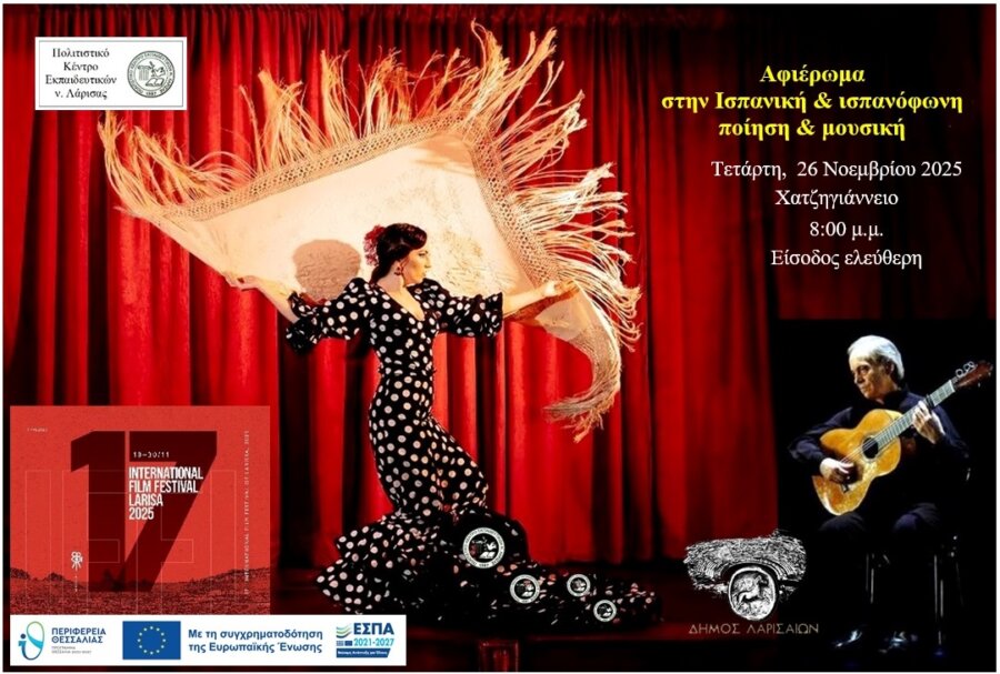 Το 17ο Διεθνές Φεστιβάλ Κινηματογράφου Λάρισας, το οποίο διοργανώνεται από την αστική μη κερδοσκοπική εταιρεία «Artfools», με συγχρηματοδότηση από το Πρόγραμμα «Θεσσαλία» (ΕΣΠΑ 2021–2027), με την υποστήριξη του Δήμου Λαρισαίων και του Γαλλικού Ινστιτούτου Λάρισας, σε συνεργασία με το ΠΟΚΕΛ – Πολιτιστικό Κέντρο Εκπαιδευτικών νομού Λάρισας, πραγματοποιεί αφιέρωμα στην Ισπανική και Ισπανόφωνη ποίηση και μουσική, το οποίο θα παρουσιαστεί στο Χατζηγιάννειο Πνευματικό Κέντρο (Ρούσβελτ 57), την Τετάρτη, 26 Νοεμβρίου 2025, στις 8:00 μ.μ., με ελεύθερη είσοδο.