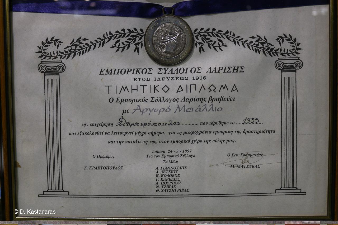 «Μοιραία, με τη συνταξιοδότησή μου, πέφτουν και οι τίτλοι τέλους φέτος τον Δεκέμβριο. Μια όμορφη διαδρομή γεμάτη κόπο, ήθος αξιοπρέπεια, σεβασμό στον πελάτη αλλά και βαθιά οικογενειακή παράδοση ολοκληρώνεται, έχοντας αγκαλιαστεί από την πόλη και τους ανθρώπους της. Η προσπάθειά μας αναγνωρίστηκε, το ότι είμαστε 90 ολόκληρα χρόνια στον ίδιο χώρο ως ενοικιαστές μιλά άλλωστε από μόνο του», απαντά στην ερώτησή μου, σημειώνοντας πως άνθρωποι από τα Γενικά Αρχεία του Κράτους τον προσέγγισαν αναζητώντας στοιχεία για την ιστορική επιχείρηση, η οποία στα 1997 βραβεύτηκε από τον Εμπορικό Σύλλογο Λάρισας με το αργυρό μετάλλιο για τη μακρόχρονη εμπορική δραστηριότητα και καταξίωση στον εμπορικό χώρο της πόλης μας.