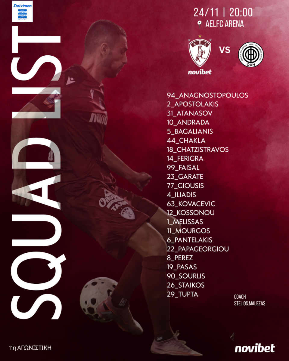 Ολοκληρώθηκε το μεσημέρι της Κυριακής (23/11) η προετοιμασία της ΑΕΛ Novibet για τον αγώνα Πρωταθλήματος με αντίπαλο τον ΟΦΗ στο AEL FC ARENA για την 11η Αγωνιστική της Stoiximan Super League (24/11, 20:00).