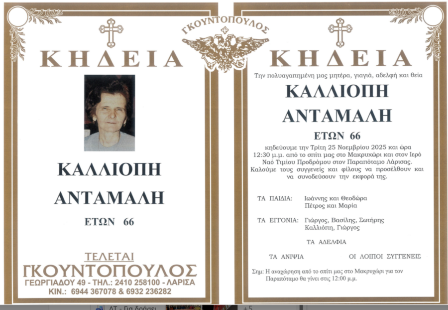 Απεβίωσε σε ηλικία 66 ετών η Καλλιόπη Ανταμάλη. Η κηδεία της θα τελεστεί αύριο Τρίτη 25 Νοεμβρίου 2025 και ώρα 12:30 μ.μ. από τον Ιερό Ναό Τιμίου Προδρόμου στον Παραπόταμο Λάρισας.