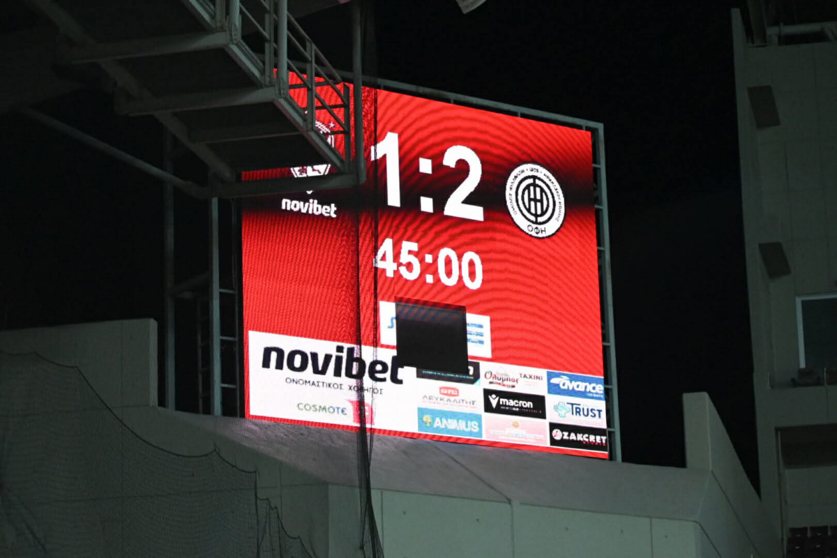 Άμεση ήταν η αντίδραση των «βυσσινί», καθώς στο 12’ ο Κοσονού έφυγε ταχύτατα στην αντεπίθεση, μοίρασε στον Γκαράτε που μπήκε στην περιοχή και με όμορφο τελείωμα έστειλε την μπάλα στα δίχτυα για το 1-1, ωστόσο πριν κοπάσουν οι πανηγυρισμοί για τη γρήγορη ισοφάριση ο ΟΦΗ «ξαναχτύπησε» και στο 15’ ο Σενγκέλια εκτέλεσε φάουλ, η μπάλα βρήκε στο τοίχος, ο Καραχάλιος επωφελήθηκε από τις κόντρες και με ωραίο τελείωμα σημείωσε το 1-2, «παγώνοντας» το FC Arena.