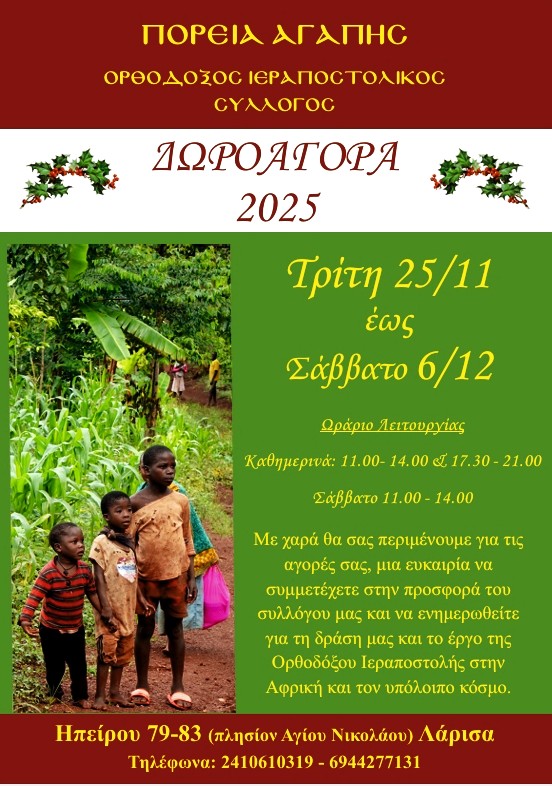 Από αύριο (Τρίτη,25 Νοεμβρίου 2025 έως και 6 Δεκεμβρίου) στην αίθουσα Κατηχητικών συνάξεων της ΠΟΡΕΙΑΣ ΑΓΑΠΗΣ,του Ορθοδόξου Ιεραποστολικού Συλλόγου που εδρεύει στη Λάρισα ( Ηπείρου 79-83 ),λειτουργεί η καθιερωμένη δωροέκθεση λογω των εορτων των Χριστουγεννων.