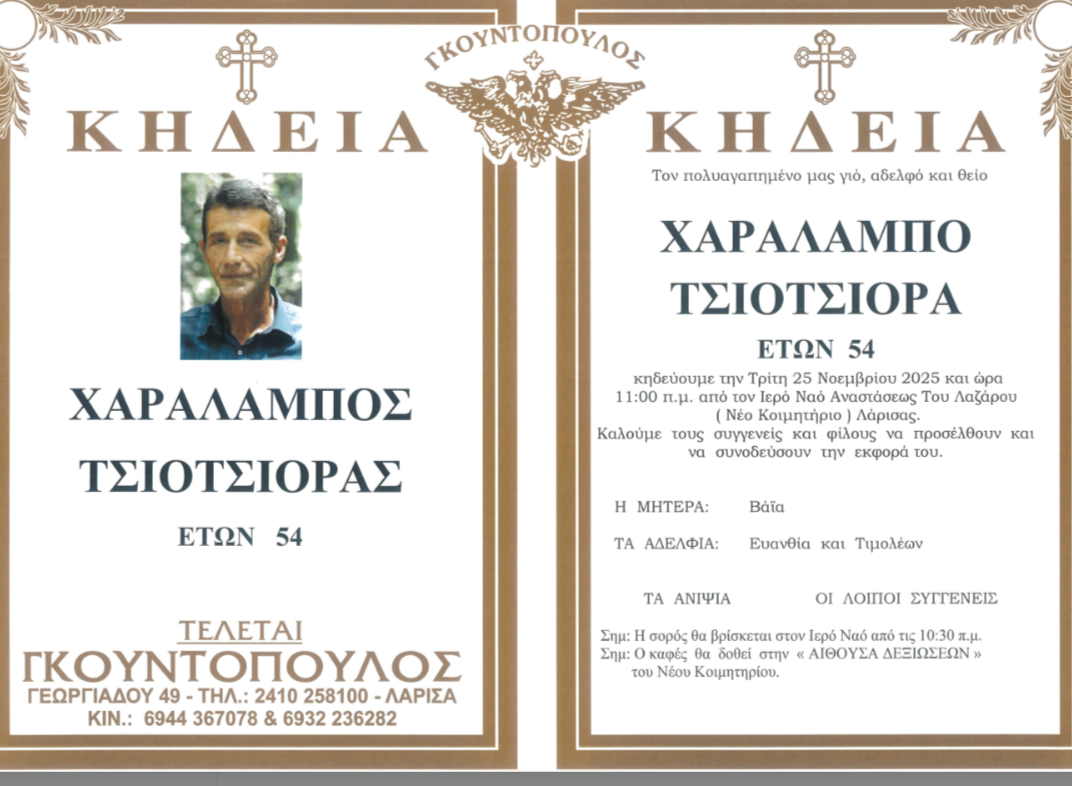 Η κηδεία του θα γίνει αύριο στις 11πμ από τον Ιερό Ναό Αναστάσεως του Λαζάρου (Νέο Κοιμητήριο) Λάρισας.