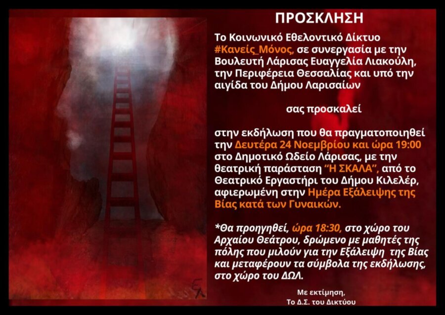Έφτασε η μεγάλη μέρα για το Δίκτυο #Κανείς_Μόνος, όπου σήμερα το απόγευμα και ώρα στις 19:00, στο Δημοτικό Ωδείο Λάρισας (ΔΩΛ), θα πραγματοποιηθεί η ετήσια κεντρική εκδήλωσή του, αφιερωμένη στην Ημέρα Εξάλειψης της Βίας κατά των Γυναικών, με ελεύθερη είσοδο για όλους τους πολίτες.