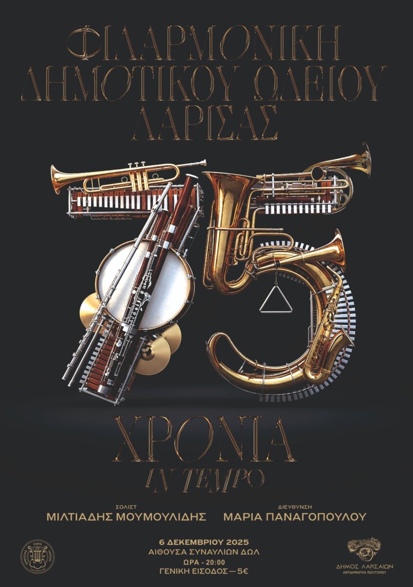 Μία μεγάλη επετειακή συναυλία με τον τίτλο «75 ΧΡΟΝΙΑ iN TEMPO», διοργανώνεται το Σάββατο 6 Δεκεμβρίου 2025, στις 20:00, στην αίθουσα συναυλιών του Δ.Ω.Λ., με αφορμή τη συμπλήρωση 75 χρόνων συνεχούς παρουσίας και προσφοράς στην πόλη της Φιλαρμονικής του Δημοτικού Ωδείου Λάρισας.