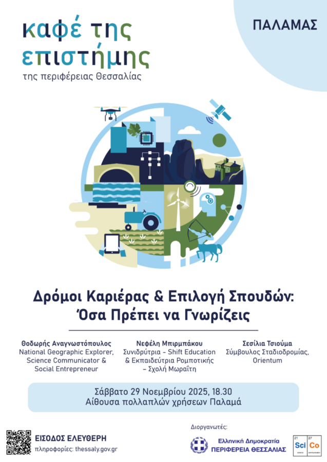 Η Περιφέρεια Θεσσαλίας, σε συνεργασία με τον εκπαιδευτικό μη κερδοσκοπικό οργανισμό SciCo – Επιστήμη Επικοινωνία, συνεχίζει το «Καφέ της Επιστήμης της Περιφέρειας Θεσσαλίας», μια σειρά ανοιχτών εκδηλώσεων που φέρνουν την επιστήμη κοντά στους πολίτες μέσα από προσιτές και ενδιαφέρουσες ομιλίες σε πόλεις και κωμοπόλεις της Θεσσαλίας.
