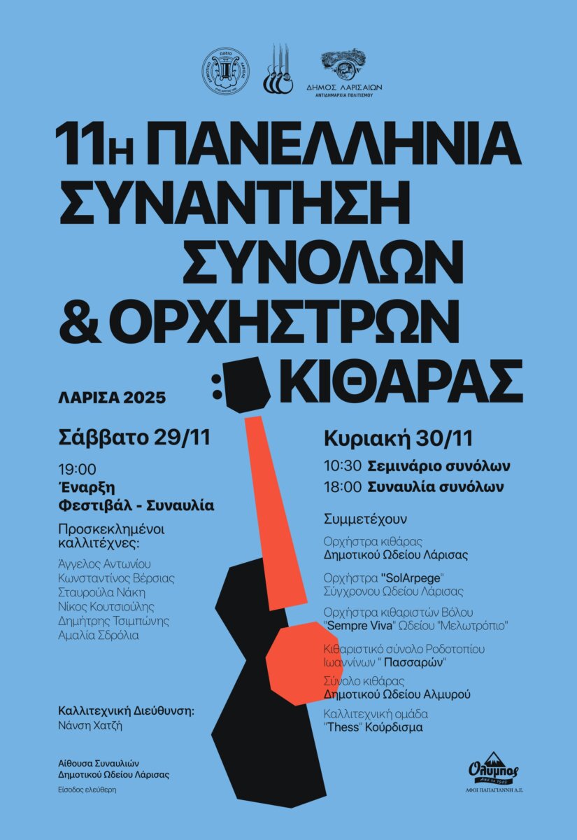 Το Δημοτικό Ωδείο Λάρισας υποδέχεται το κοινό σε ένα διήμερο αφιερωμένο στον κόσμο της κλασικής κιθάρας, στο πλαίσιο της 11ης Πανελλήνιας Συνάντησης Συνόλων και Ορχηστρών Κιθάρας που θα πραγματοποιηθεί το Σάββατο 29 και την Κυριακή 30 Νοεμβρίου 2025.