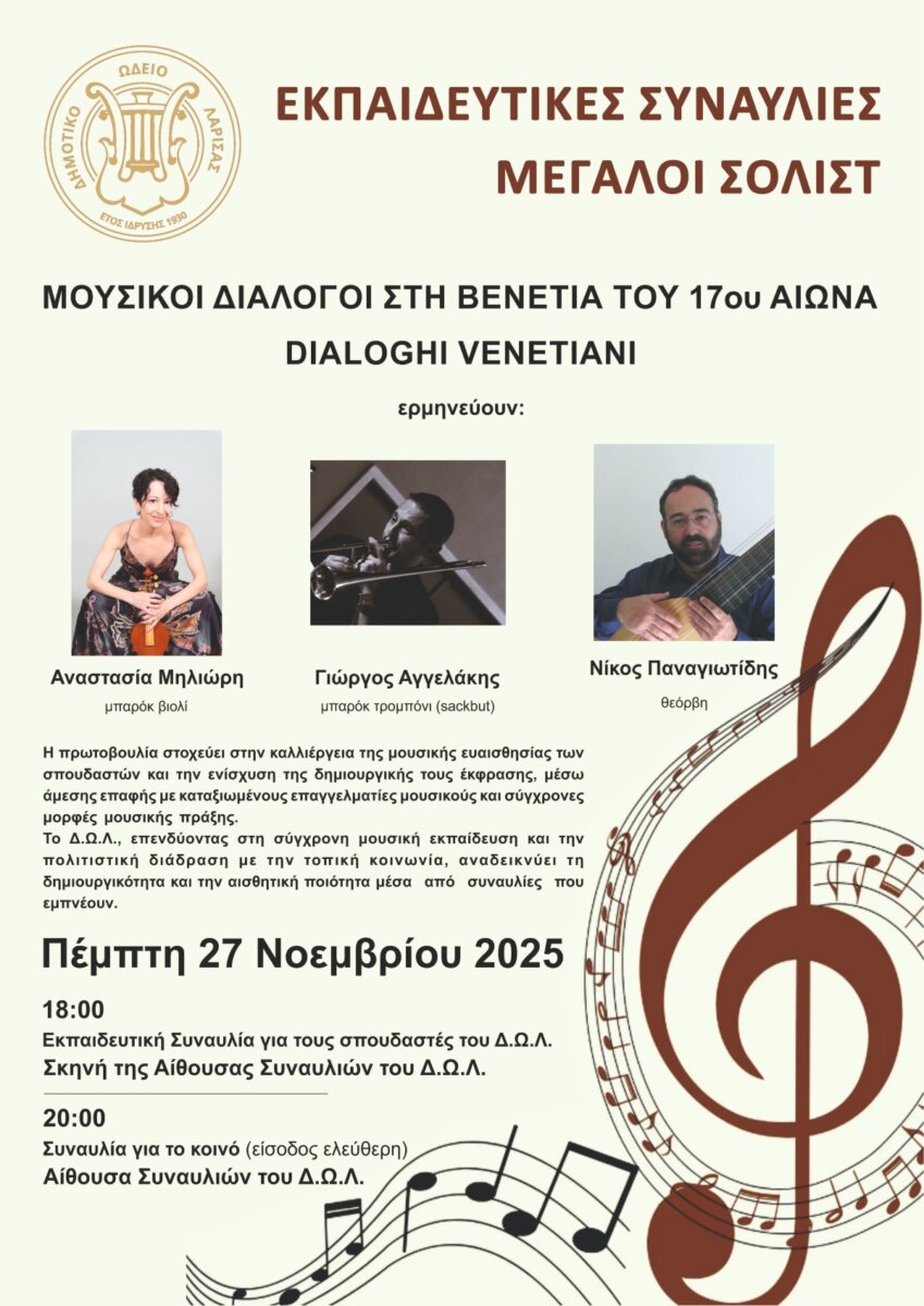 Το μουσικό πρόγραμμα «Dialoghi Veneziani» φέρνει στο Δημοτικό Ωδείο Λάρισας έναν κόσμο γεμάτο χρώμα, φαντασία και ήχους μιας εποχής όπου η μουσική εξελισσόταν με ασυνήθιστη τόλμη. Με όργανα εποχής και ρεπερτόριο από τις αρχές του 17ου αιώνα, οι καλλιτέχνες ξεδιπλώνουν έναν ηχητικό καμβά που γεννήθηκε στη Βενετία, μια πόλη που υπήρξε πυρήνας δημιουργικότητας και καινοτομίας στην πρώιμη μπαρόκ περίοδο. Στη συναυλία συμμετέχουν οι Αναστασία Μηλιώρη στο μπαρόκ βιολί, ο Γιώργος Αγγελάκης στο μπαρόκ τρομπόνι και ο Νίκος Παναγιωτίδης στη θεόρβη.