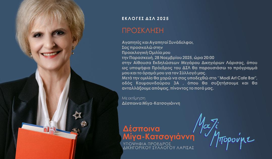 Πρόσκληση απευθύνει η υποψήφια Πρόεδρος του Δικηγορικού Συλλόγου Λάρισας Δέσποινα Μίγα – Κατσογιάννη προς όλες τις συναδέλφισσες και τους συναδέλφους να παραστούν την Παρασκευή 28 Νοεμβρίου 2025 και ώρα 20.00,στην Αίθουσα Εκδηλώσεων του Μεγάρου Δικηγόρων Λάρισας, όπου θα παρουσιάσει τις βασικές προγραμματικές της θέσεις και το όραμά της για τον Σύλλογο.