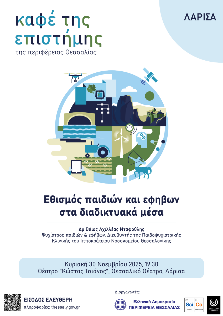 Η Περιφέρεια Θεσσαλίας, σε συνεργασία με τον εκπαιδευτικό μη κερδοσκοπικό οργανισμό «SciCo – Επιστήμη Επικοινωνία», συνεχίζει το «Καφέ της Επιστήμης της Περιφέρειας Θεσσαλίας», μια σειρά ανοιχτών εκδηλώσεων που φέρνουν την επιστήμη κοντά στους πολίτες μέσα από προσιτές και ενδιαφέρουσες ομιλίες σε πόλεις και κωμοπόλεις της Θεσσαλίας.