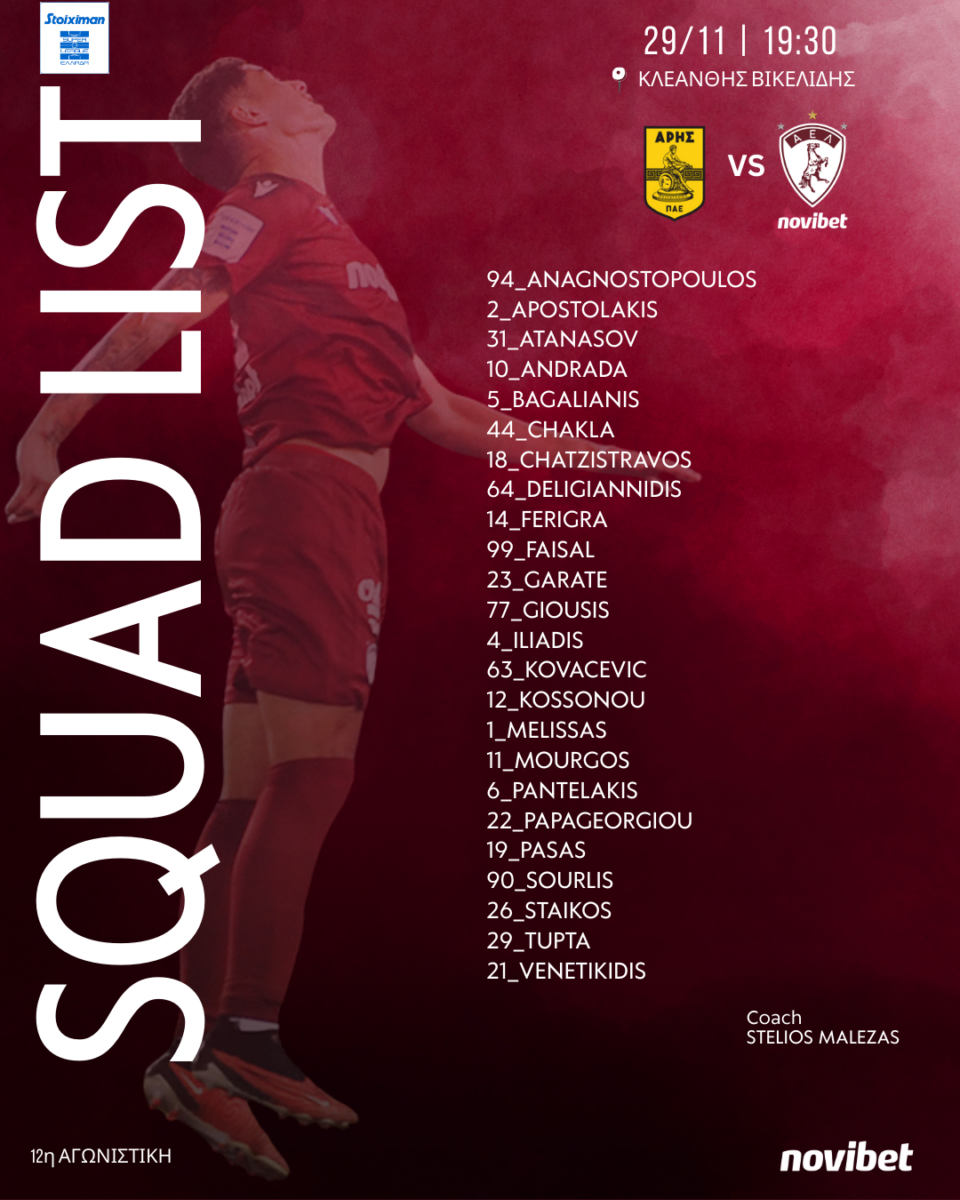 Ολοκληρώθηκε το πρωί της Παρασκευής (28/11) η προετοιμασία της ΑΕΛ Novibet για τον αγώνα Πρωταθλήματος με αντίπαλο τον Άρη στο «Κλεάνθης Βικελίδης» για την 12η Αγωνιστική της Stoiximan Super League (29/11, 19:30).