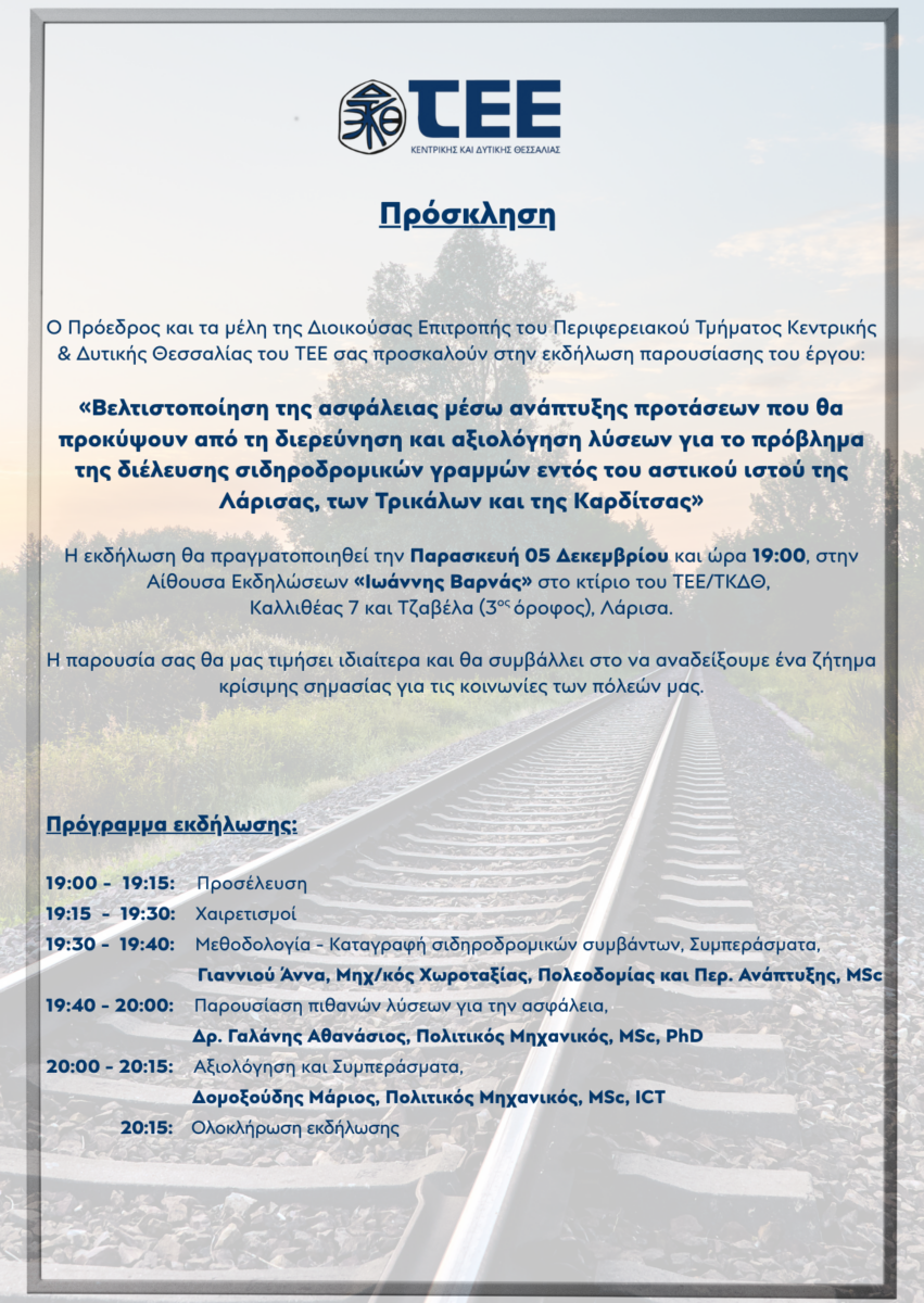 Το Περιφερειακό Τμήμα Κεντρικής & Δυτικής Θεσσαλίας του ΤΕΕ, διοργανώνει εκδήλωση παρουσίασης του Έργου με τίτλο: «Βελτιστοποίηση της ασφάλειας μέσω ανάπτυξης προτάσεων που θα προκύψουν από τη διερεύνηση και αξιολόγηση λύσεων για το πρόβλημα της διέλευσης σιδηροδρομικών γραμμών εντός του αστικού ιστού της Λάρισας, των Τρικάλων και της Καρδίτσας».