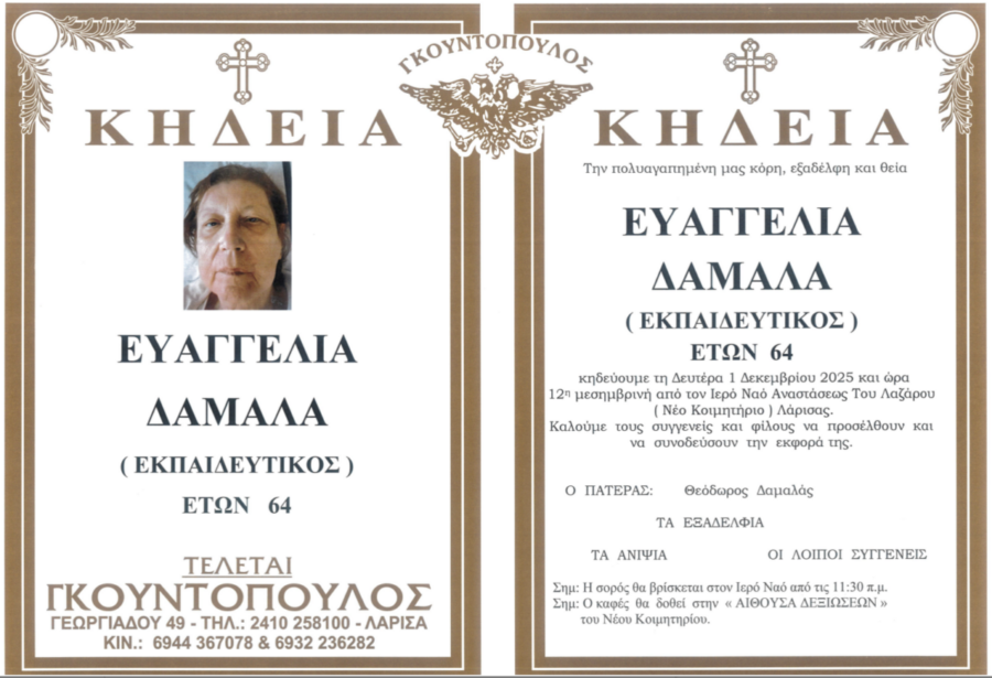Η κηδεία της θα τελεστεί αύριο Δευτέρα 1 Δεκεμβρίου 2025 και ώρα 12.00 μ. στον Ιερό Ναό Αναστάσεως του Λαζάρου (Νέο Κοιμητήριο) Λάρισας.