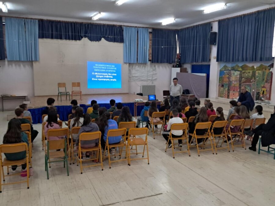 Στην συνέχεια, ο κ. Κουκούλης παρουσίασε στους μαθητές/τριες τις δράσεις και το έργο του Φιλανθρωπικού & Πολιτιστικού Συλλόγου “Η ΑΡΩΓΗ”, Αμπελώνα που αφορούν την κοινωνική Αλληλεγγύη, με την διάθεση τροφίμων – ρούχων – παιχνιδιών, δράσεις κοινωνικής αλληλεγγύης για τους σεισμόπληκτους της Τουρκίας και Συρίας, για τους πλημμυροπαθείς της Φαλάνης, εκδηλώσεις όπως η Χριστουγεννιάτικη Φιλανθρωπική Εκδήλωση της Μικτής Χορωδίας, το Πασχαλινό Φιλανθρωπικό Μπαζάαρ, αλλά και τις πολιτιστικές δράσεις του Συλλόγου με παρουσιάσεις βιβλίων, ομιλίες με ιατρικά θέματα, διοργάνωση σεμιναρίων πρώτων Βοηθειών – ΚΑΡΠΑ, προμήθεια Εξωτερικού Απινιδωτή, εκδηλώσεις με την Μικτή Χορωδία και άλλες.