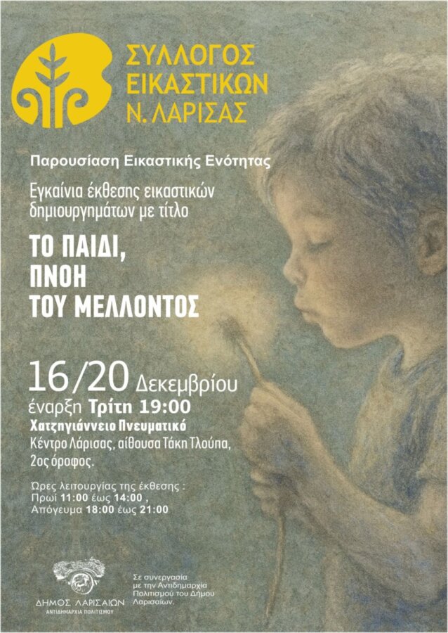 Ο Σύλλογος Εικαστικών Ν. Λάρισας, σε συνεργασία με την Αντιδημαρχία Πολιτισμού του Δήμου Λαρισαίων, διοργανώνουν έκθεση εικαστικών δημιουργημάτων με τίτλο, “Παιδί, πνοή του μέλλοντος”.