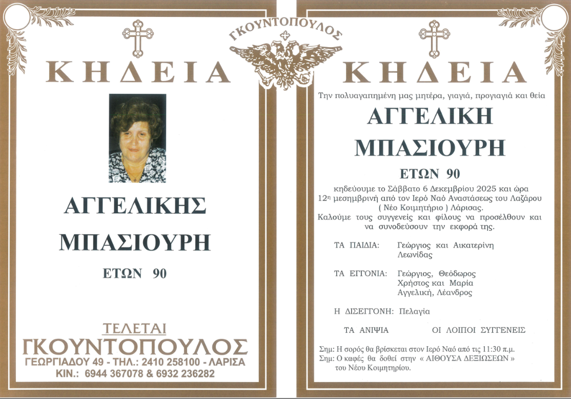Η κηδεία της θα γίνει αύριο Σάββατο στις 12 το μεσημέρι από τον Ιερό Ναό Αναστάσεως του Λαζάρου (Νέο Κοιμητήριο) Λάρισας.