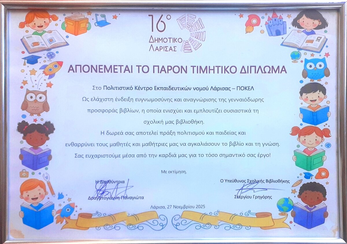 Οι μαθητές και οι μαθήτριες του 16ου Δημοτικού Σχολείου χάρισαν μια ευχετήρια κάρτα στο ΠΟΚΕΛ, όπου ευχαρίστησαν τους εκπαιδευτικούς για τους σπόρους γνώσης, που φυτεύουν με αυτήν την προσπάθειά τους, καθώς και μια γλάστρα με ένα φυτό χριστουγεννιάτικο, ενώ η διευθύντρια και ο υπεύθυνος της βιβλιοθήκης απένειμαν τιμητικό δίπλωμα ευγνωμοσύνης.