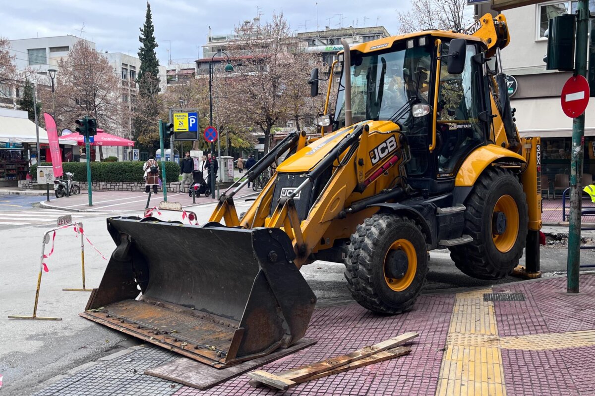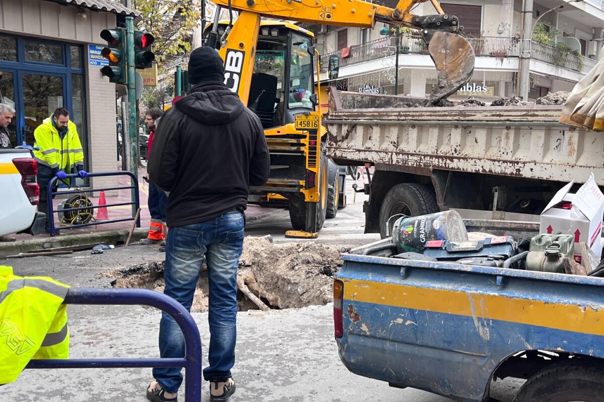 Επέμβαση των συνεργείων της Τεχνικής Υπηρεσίας του δήμου Λαρισαίων στο σημείο όπου υποχώρησε το οδόστρωμα επί της οδού Μανδηλαρά στο κέντρο της Λάρισας πραγματοποιήθηκε το πρωί της Κυριακής.