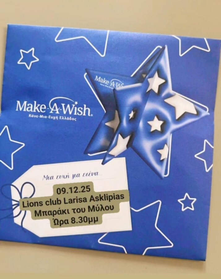 Η λέσχη Lions Λάρισα Aσκληπιάς σε συνεργασία με την Επιτροπή κατά του Παιδικού Καρκίνου των Lions του Θέματος 117Β Ελλάδα Κύπρος που ανήκουν στο μεγαλύτερο άνθρωπιστικό οργανισμό παγκοσμίως με 1,5 εκατομμύριο μέλη σε ολόκληρο τον κόσμο, μας προσκαλούν την Τριτη 9 Δεκεμβρίου στις 8:30μμ στο Μπαράκι του Μυλου να υποστηρίξουμε την φιλανθρωπική βραδιά “Γιορτή των Αστεριών”. Η βραδιά με ζωντανή μουσική είναι αφιερωμένη στα αστέρια του make a wish, όσο περισσότερα αστέρια ευχής πάρουμε θα υλοποιήσουμε ευχές παιδιών που η ζωή τους είναι σε κίνδυνο. Ας είμαστε όλοι μαζί σε αυτη την όμορφη μουσική βραδιά που ειναι αφιερωμένη σε ιερό σκοπό.