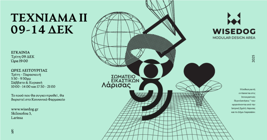 Το Σωματείο Εικαστικών Λάρισας «8» διοργανώνει τη χριστουγεννιάτικη εικαστική έκθεση φιλανθρωπικού χαρακτήρα με τίτλο «ΤΕΧΝΙΑΜΑ ΙΙ», η οποία θα φιλοξενηθεί στον χώρο του Wisedog από τις 9 έως τις 14 Δεκεμβρίου.