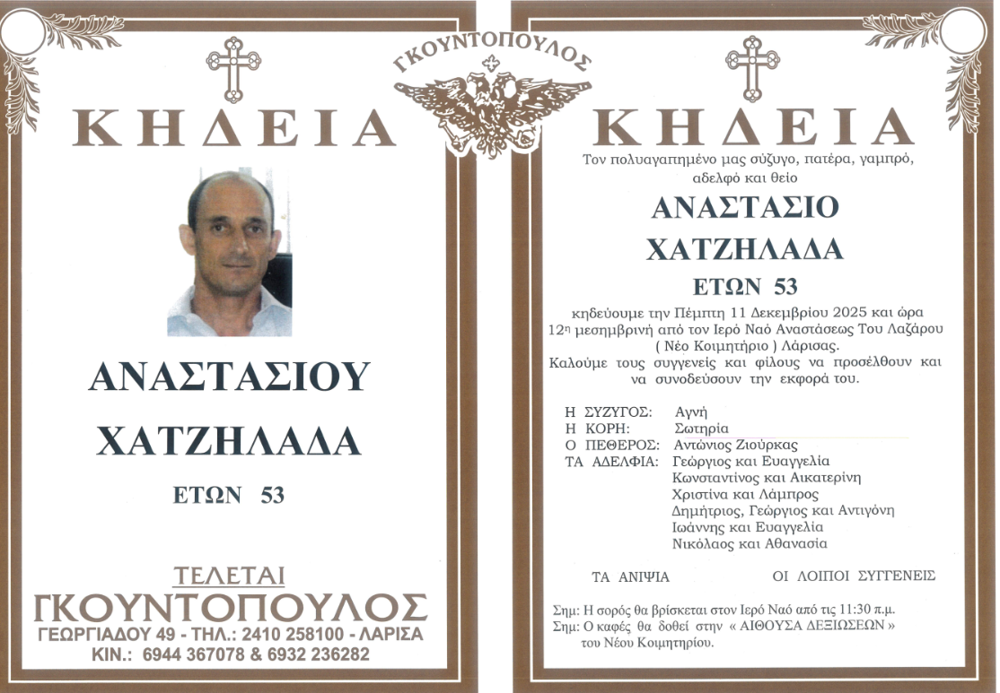 Η κηδεία του θα γίνει αύριο Πέμπτη στις 12 το μεσημέρι από τον Ιερό Ναό Αναστάσεως του Λαζάρου (Νέο Κοιμητήριο Λάρισας).