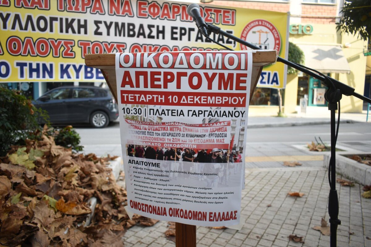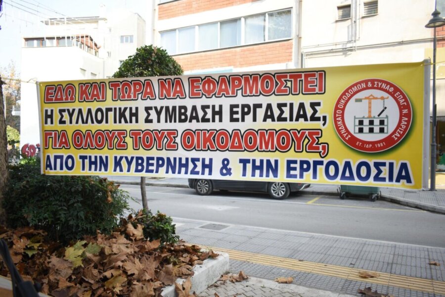 Πανελλαδική πανοικοδομική απεργία πραγματοποιείται σήμερα στη Λάρισα ενάντια «στους αντεργατικούς νόμους της κυβέρνησης με άμεσο αίτημα την ενεργοποίηση Συλλογικών Συμβάσεων Εργασίας».