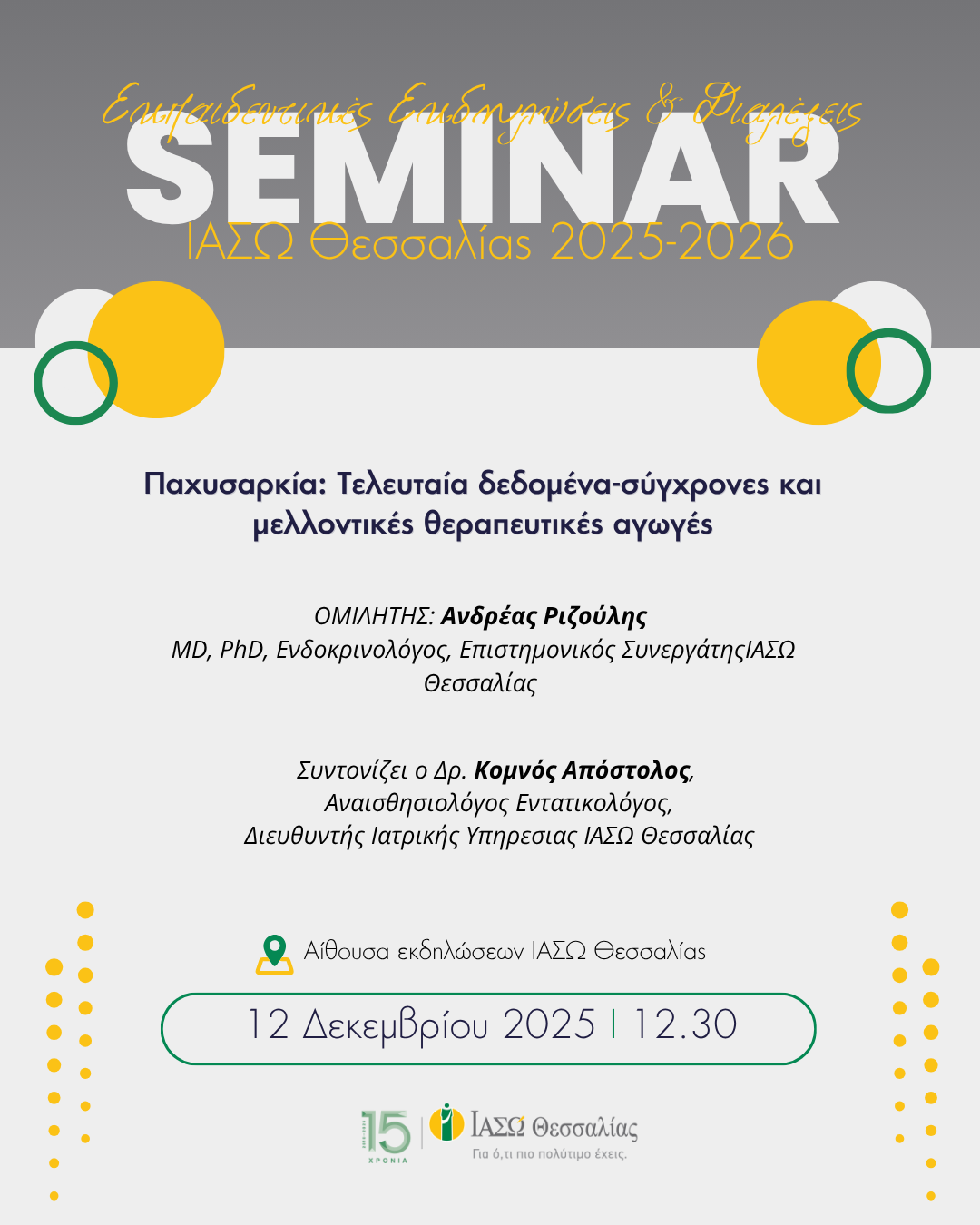 Αύριο Παρασκευή 12 Δεκεμβρίου στις 12:30, σας προσκαλούμε στην Αίθουσα Εκδηλώσεων ΙΑΣΩ Θεσσαλίας σε ένα επιστημονικό σεμινάριο που φωτίζει τις πιο πρόσφατες εξελίξεις στον τομέα: