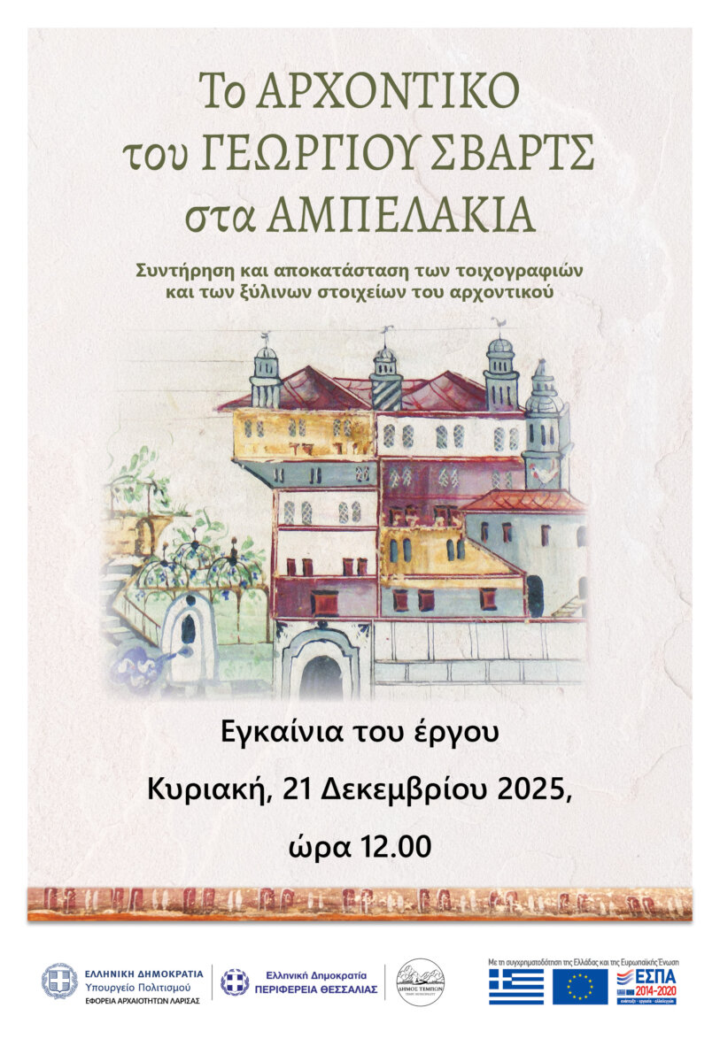 Την Κυριακή 21 Δεκεμβρίου 2025 στις 12.00 το μεσημέρι θα τελεσθούν τα επίσημα εγκαίνια του Αρχοντικού του Γεωργίου Σβαρτς στα Αμπελάκια, μετά την ολοκλήρωση των εκτεταμένων εργασιών συντήρησης και ανάδειξης του μνημείου, που πραγματοποιήθηκαν με τη χρηματοδότηση του ΕΣΠΑ Θεσσαλίας 2014-2020.